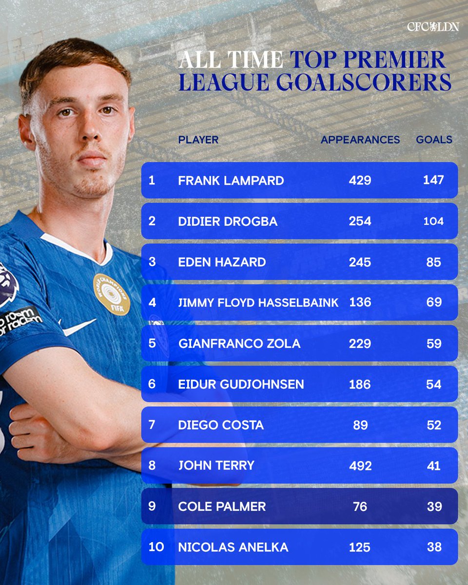 虎扑12月14日讯切尔西官方推特发布了队史射手榜,帕尔默目前位列第九: