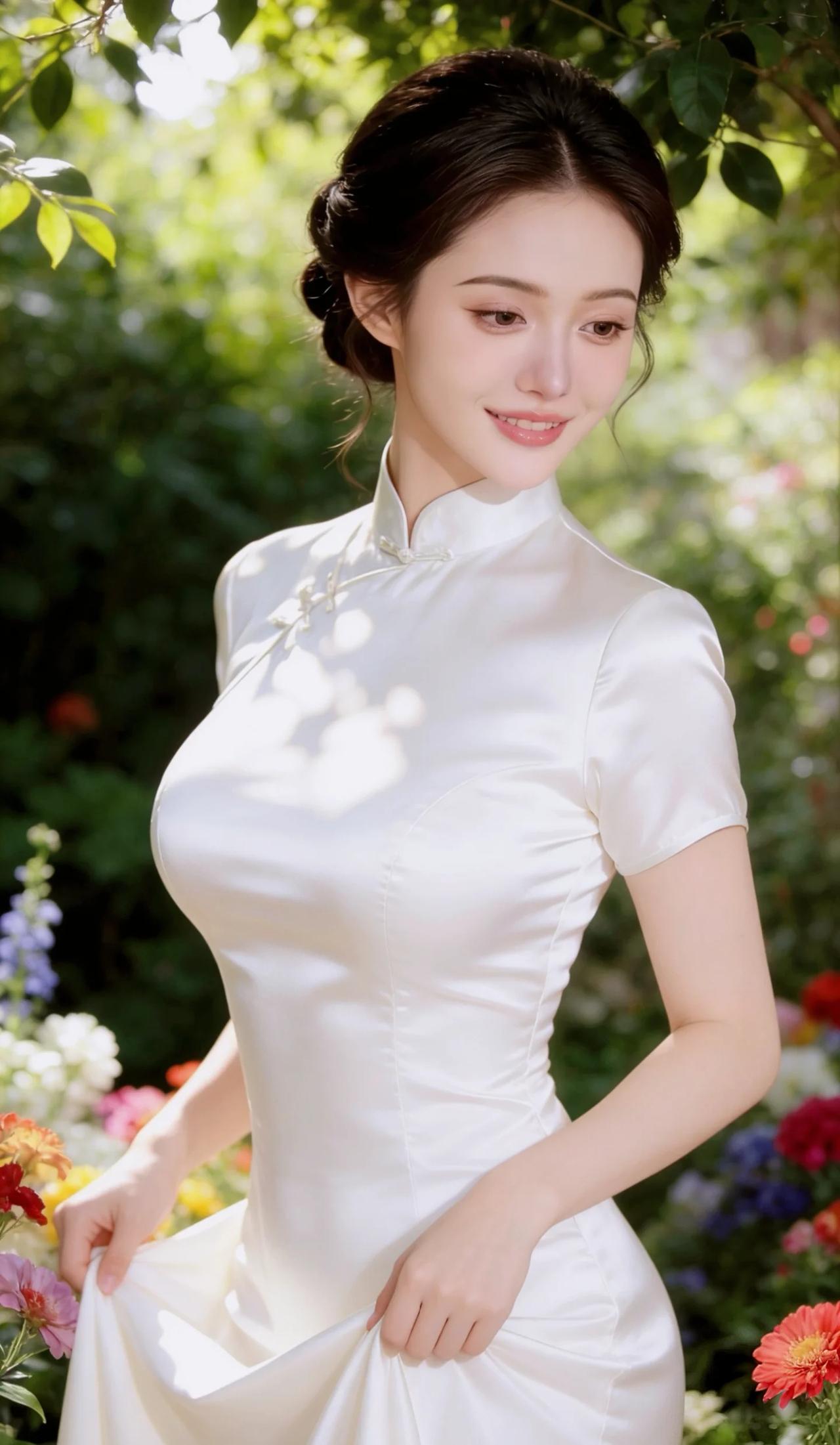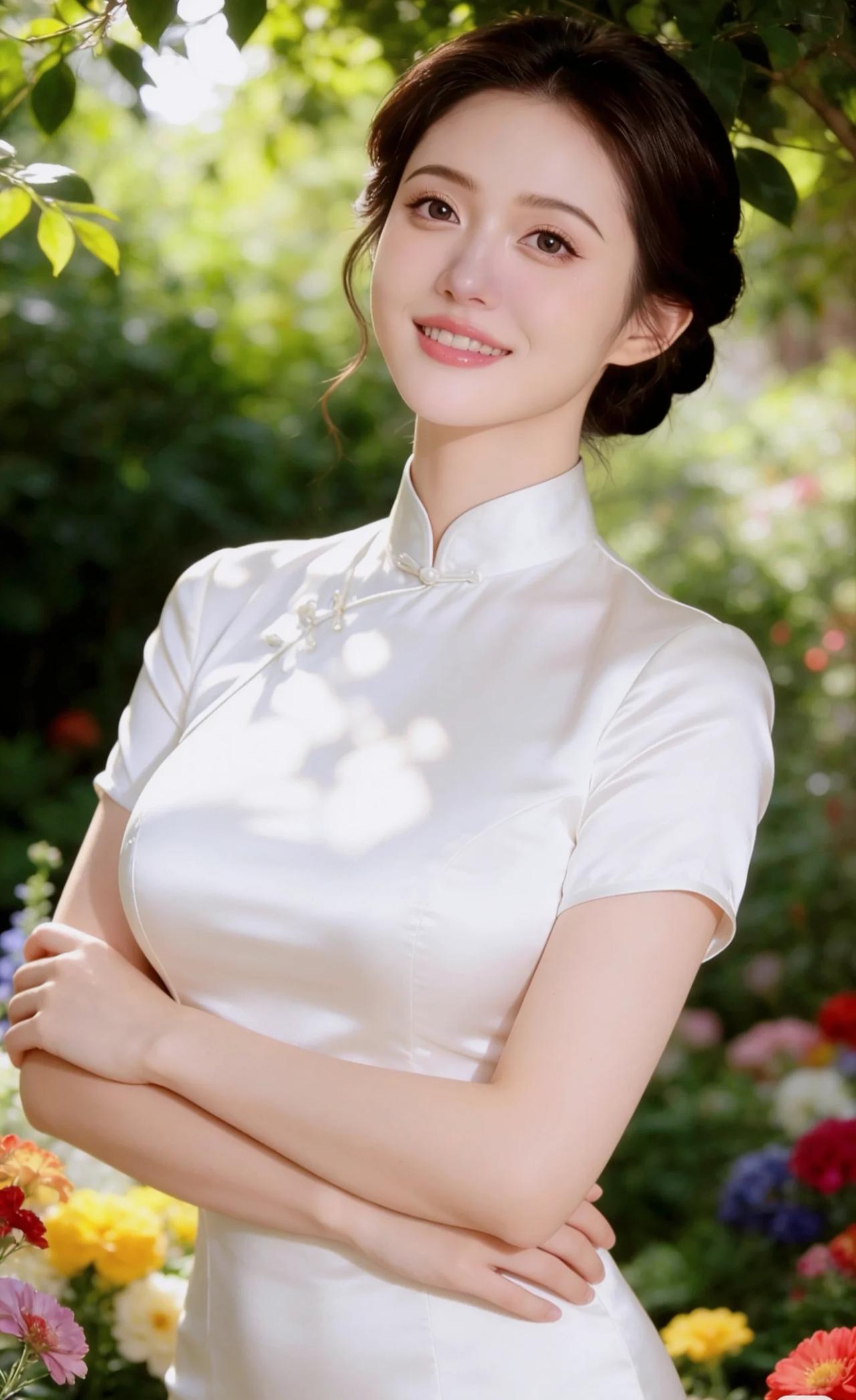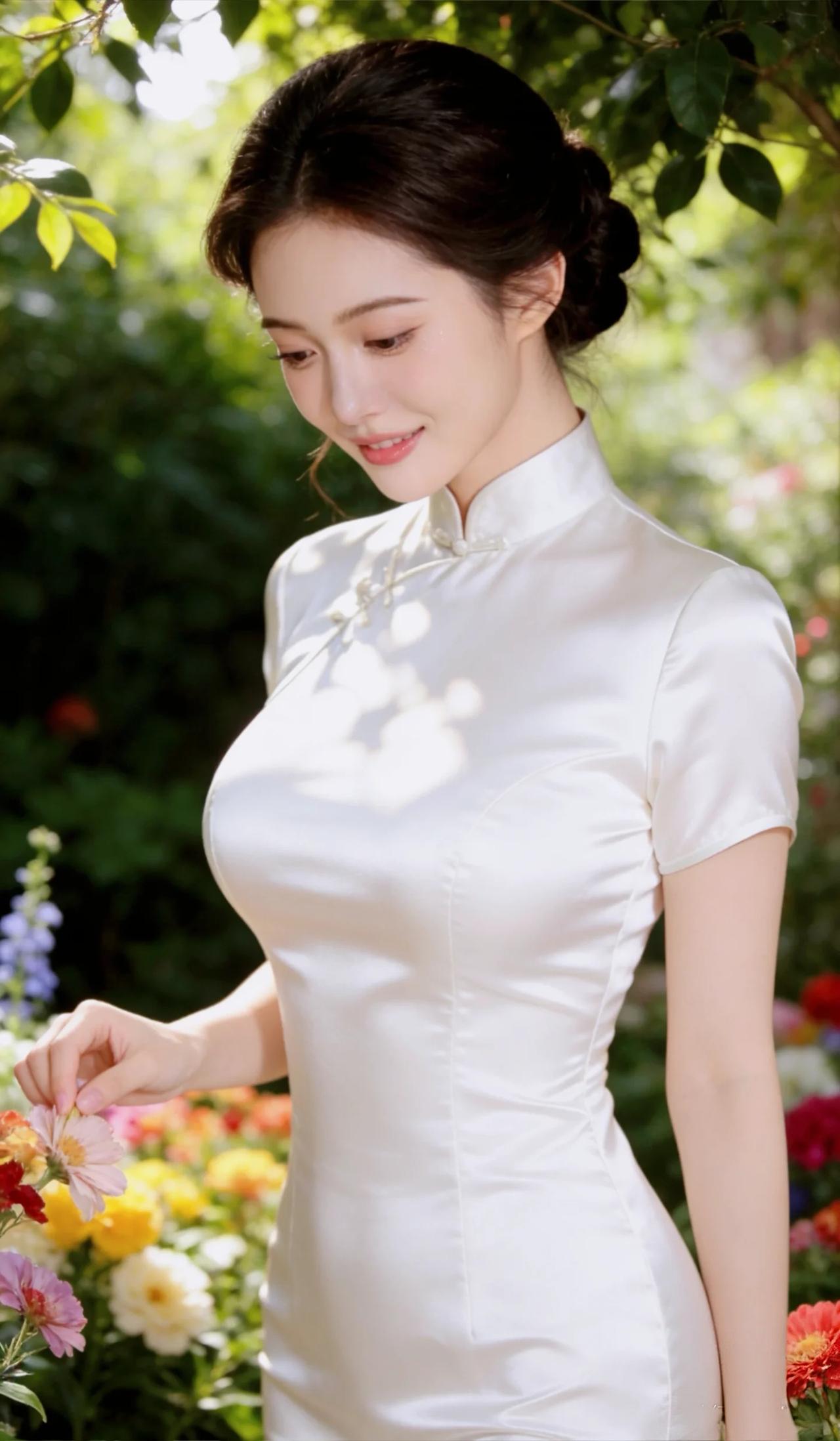 - 款式细节 :旗袍采用经典的立领设计,短袖款式简约大方;胸前配有精致的盘扣,增添了传统韵味。 - 材质特点 :面料具有一定的光泽度,质感细腻,提升了整体的高级感。 - 设计风格 :整体设计风格融合了传统与现代元素,既保留了旗袍的经典轮廓,又通过简洁的线条展现出时尚感。 - 色彩搭配 :纯白色调清新淡雅,凸显出女性的优雅气质,同时与背景的绿色植物形成和谐对比。