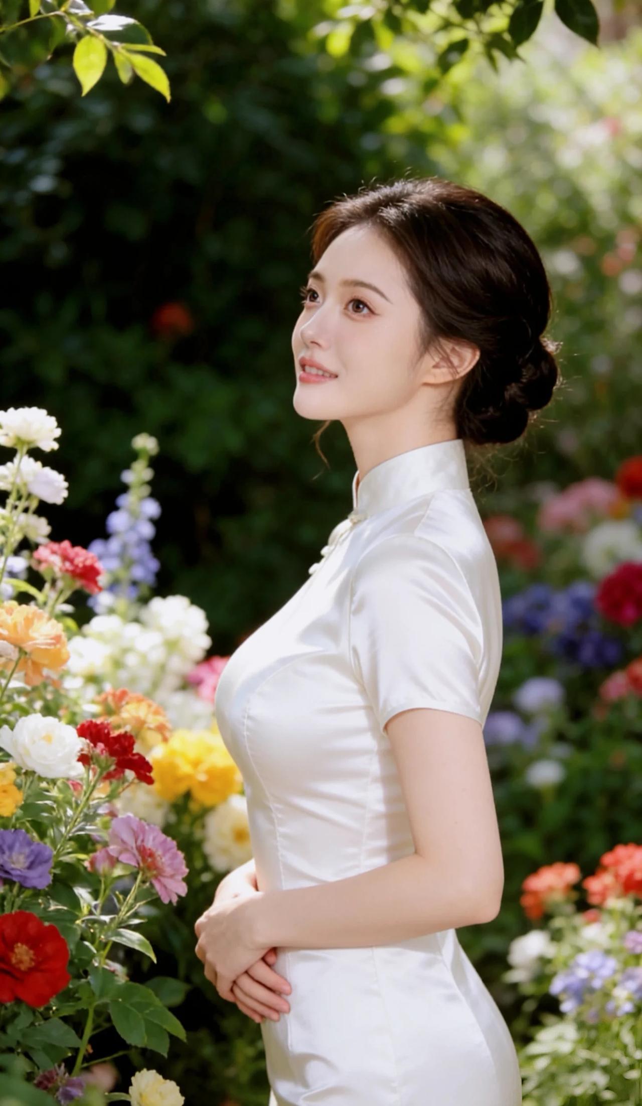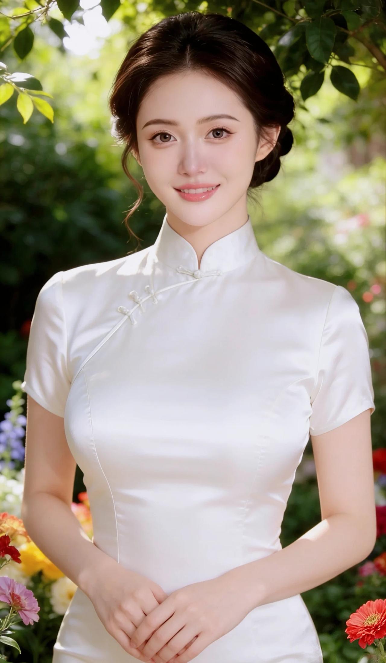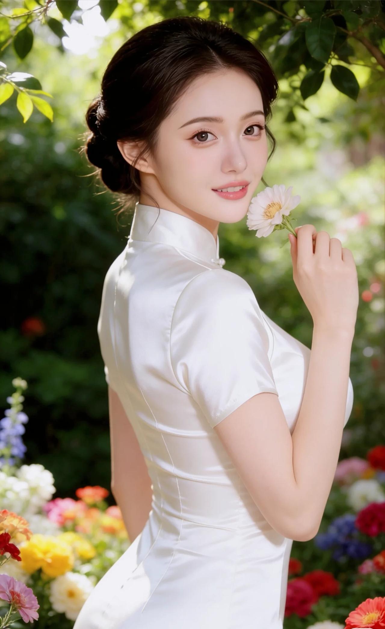 - 款式细节 :旗袍采用经典的立领设计,短袖款式简约大方;胸前配有精致的盘扣,增添了传统韵味。 - 材质特点 :面料具有一定的光泽度,质感细腻,提升了整体的高级感。 - 设计风格 :整体设计风格融合了传统与现代元素,既保留了旗袍的经典轮廓,又通过简洁的线条展现出时尚感。 - 色彩搭配 :纯白色调清新淡雅,凸显出女性的优雅气质,同时与背景的绿色植物形成和谐对比。