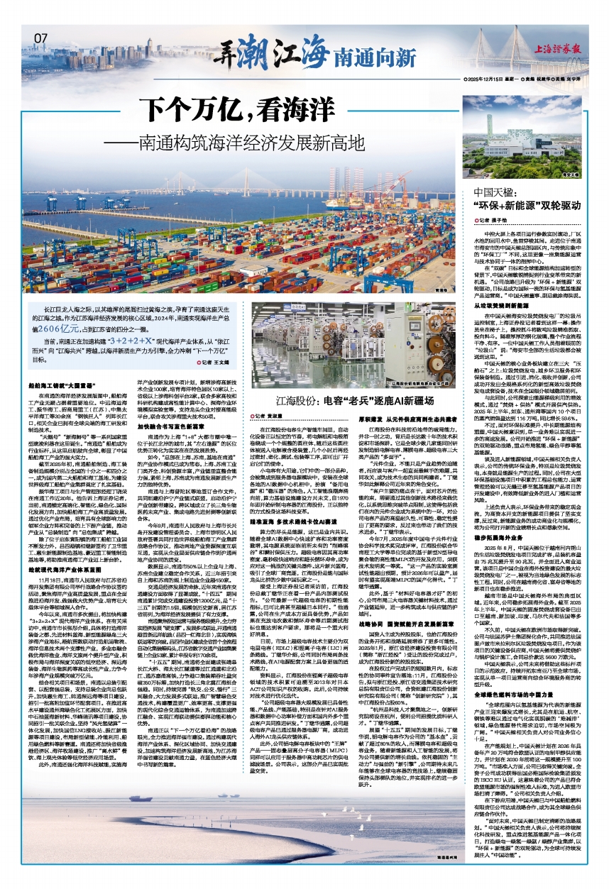 振华海工项目与生产管理部经理丁晓荣在南通工作近20年。他告诉上海证券报记者,当前,南通锚定高端化、智能化、绿色化、国际化发展方向,加快船舶海工产业高质量发展。通过优化产业布局,培育具有全球影响力的领军企业方阵和完备的上下游产业链,推动产业从“总装制造”向“总包集成”跨越。