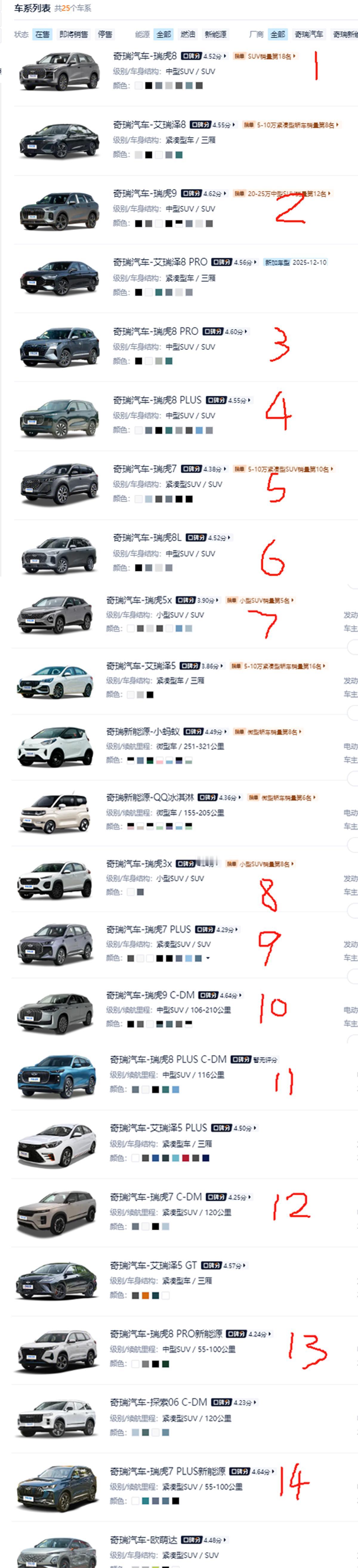 真是不看不知道,奇瑞的瑞虎序列车型竟然有14款之多! 奇瑞的瑞虎车型从3到9基本都有了,这其中又分出了PLUS、PRO等等,那么瑞虎系列到底有多少车型呢?看了一下汽车之家的奇瑞瑞虎车型细分,居然有14款之多啊! 不过有销量统计数据的只有5款,可以看出是3、5、7、8、9的各个数字序列的不同车型整合起来统计销量数据的。 不过奇瑞是不是需要梳理一下目前的SUV体系呢?“多生孩子好打架”不如集中优势力量。【来自懂车帝车友圈】