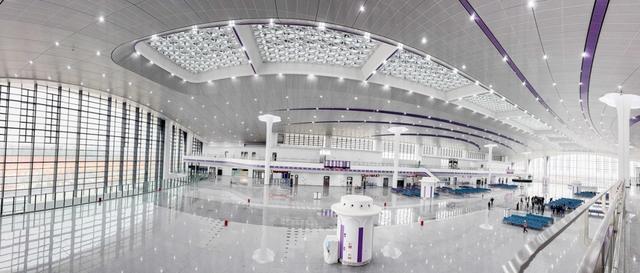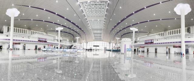 来自中国铁设的湛江北站设计负责人张红云介绍,湛江北站以“紫荆‘湛’放”作为设计理念,深度提炼市花紫荆花的文化意象,实现自然之美与建筑功能的融合。从空中俯视,站房屋面就像绽放的花瓣般柔美舒展,正立面8棵壁柱贴合受力需求,形似含苞的紫荆花枝,韵律感贯穿建筑整体。站内,紫荆花的藤紫色从进站厅、候车厅延伸至出站厅,形成连贯视觉脉络。集散厅内,结合传统水墨画与现代技术的百米长卷,以散点透视勾勒出“中国第一长滩”(湛江东海岛龙海天沙滩)的海岸天际线。
