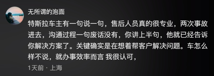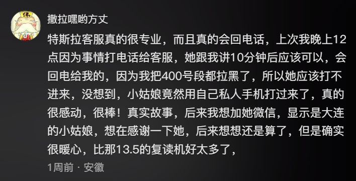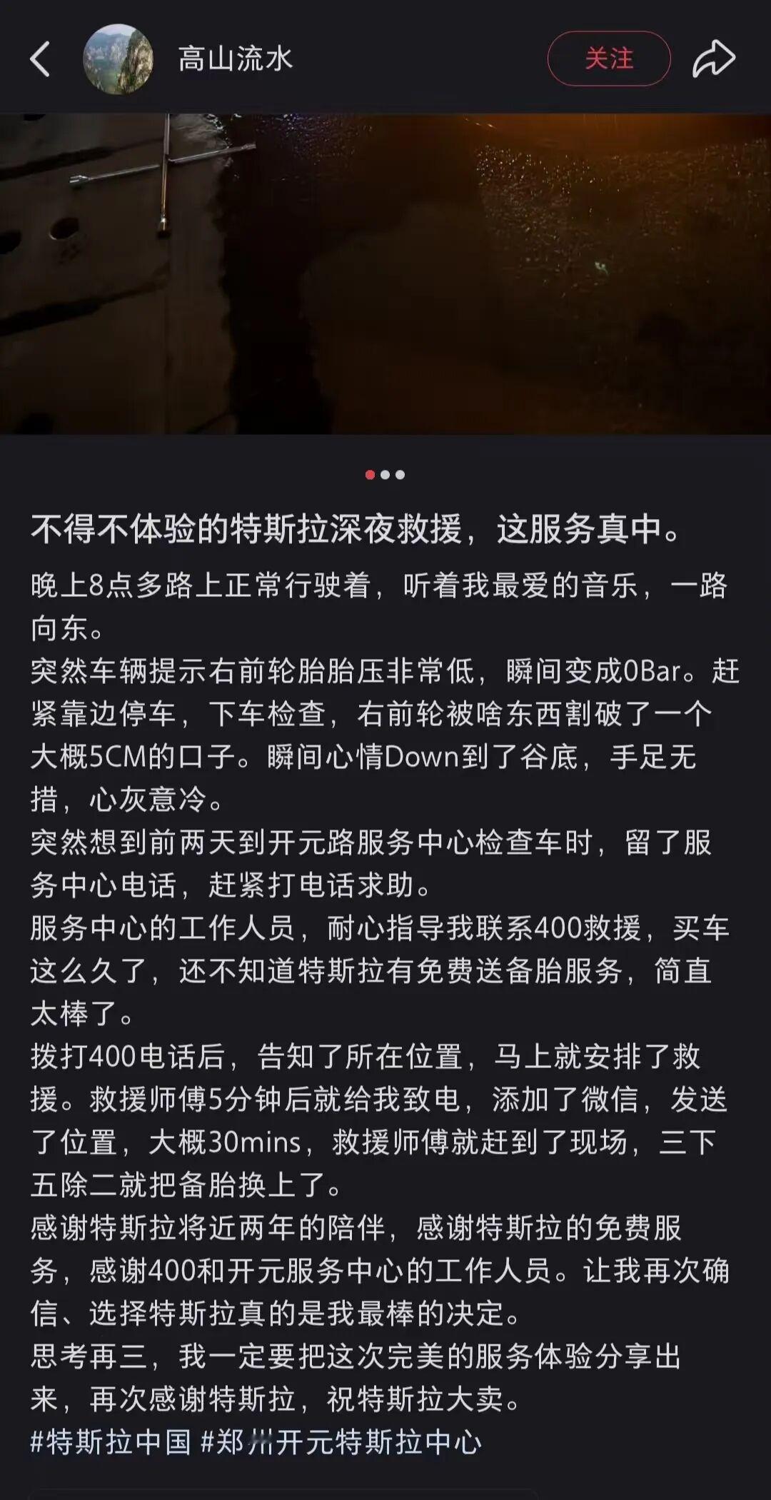 深夜爆胎?特斯拉客服把售后做成教科书:秒响应无废话,自带备胎到现场如果说维修是“治病”,那么救援就是“救命”。在突发状况下,售后服务的响应速度直接关乎车主的安全感。为了实现更大的空间和更长的续航,如今很多新能源车型都取消了备胎。一旦在高速或旅途中遭遇爆胎,车主只能等待拖车,前往维修站。而特斯拉是目前极少数在道路救援中“自带备胎”的品牌。这一看似不起眼的细节,却能在关键时刻解决问题。网友高山流水 分享了自己的亲身经历,“打完救援电话后,大约30分钟师傅就到了。最让我惊喜的是特斯拉竟然提供免费备胎服务。贴心的服务体验让我更确信,选特斯拉是最棒的决定”。属于特斯拉的高效服务,在更多车主的故事里被反复验证。通过国内媒体新浪科技 发布的视频可以看到,一位特斯拉车主凌晨为车辆充电时出现故障,拨打特斯拉道路救援电话后秒接通。随后,车主在客服人员的指导下逐步操作等待车辆解除警报。在警报解除后,特斯拉客服人员主动回电,了解情况。这种“不废话、高效率”的风格早已在车主圈形成口碑:“有一次我深夜求助,因为把400号段都拉黑了无法回电,没想到客服竟然用自己私人手机打过来了,真的很感动”;“特斯拉的售后真的尊重你,哪怕是小问题,也会把服务做到最好,反正我一直会选择特斯拉”;“特斯拉的售后人员真的很专业,两次事故,沟通过程一句废话没有,可以迅速给出解决方案。”特斯拉《2024年影响力报告》内容显示,特斯拉服务中心体验满意度高达93%,试驾满意度超90%,交付满意度也超过92%。优秀的服务可以让用车生活“从拥有一辆车”变成“享受一种生活方式”。正如网友车轮上的小梦 所说:“车是冰冷的机械,但服务连接的是有温度的生活。选车时多留意那些看不见的关怀,这远比参数表上的数字更值得关注。”特斯拉科技改变生活新能源汽车