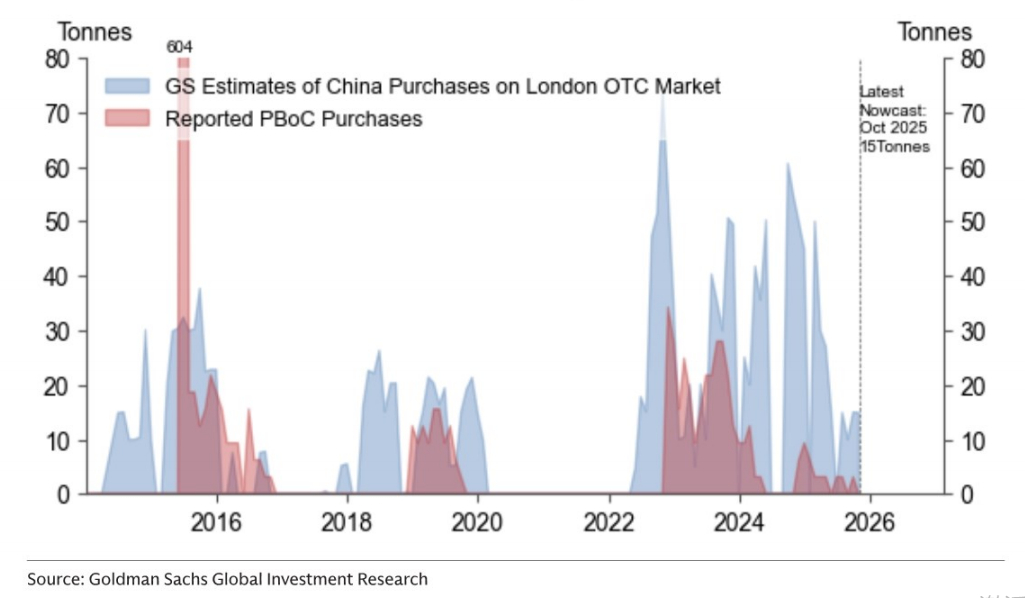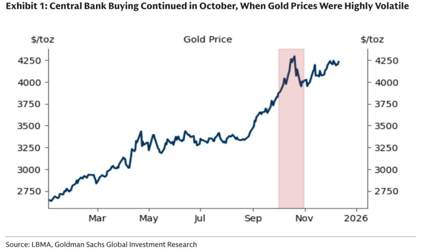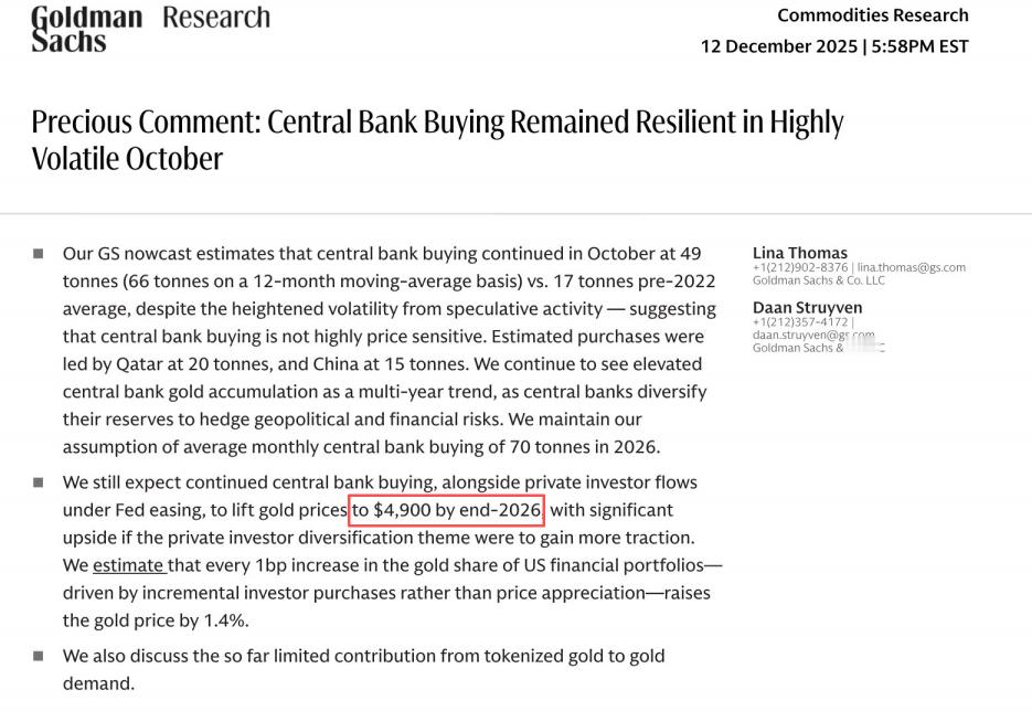 高盛上周五发布的贵金属报告指出,美国居民配置黄金的比例仍较低仅0.17%(比2012年高点仍低6bp),而每升高1bp将对金价提振+1.4%,推算若补充到之前高点,则金价应在4600美元+。同时,认为央行无惧金价波动持续买入,对明年央行的购买维持70吨/月的预计,到2026年底金价将升至4900美元/盎司。