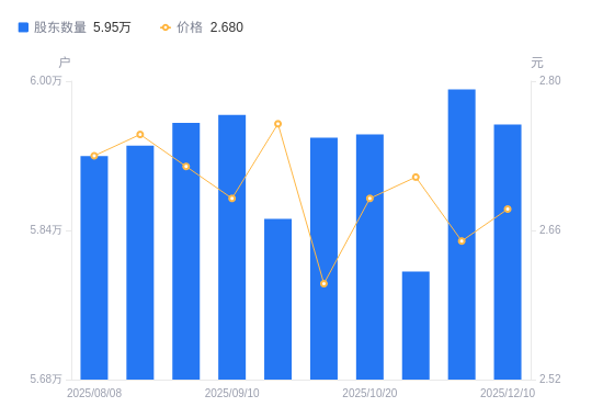近一年(2024年12月10日至2025年12月10日),中国铁物A股股东户数从5.94万户,增加至5.95万户,增幅0.29%,区间股价下跌8.00%。