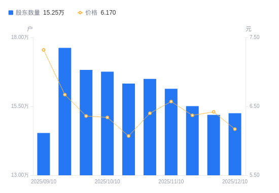 日期A股户数(户)流通A股户均持股数(股)户均持股市值(万元)2025-12-101525328961.295.532025-11-281519418996.155.782025-11-201550868813.725.612025-11-101613868469.665.562025-10-311649668285.855.302025-10-201632638372.285.082025-10-101676108155.155.172025-09-301682478124.275.172025-09-191762167756.875.172025-09-101453309405.386.88