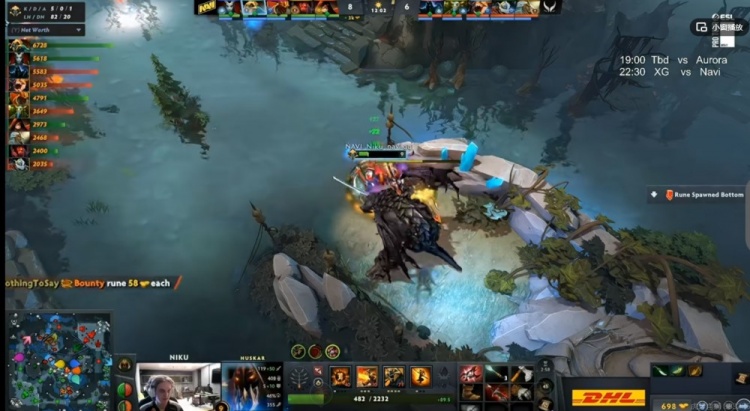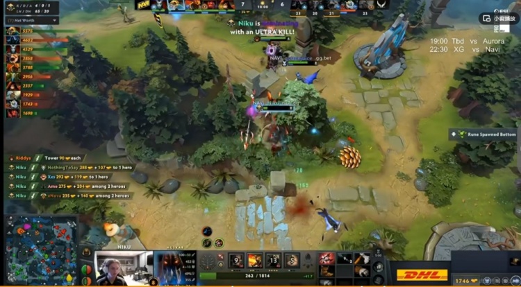 [10分钟]XG下路强动Niku哈斯卡但是他有臂章啊!Xxs獣冲锋直接被哈斯卡心炎弹飞!支援到位的Ame亚巴顿也没大啊!这波NAVI直接击杀XG四人,Niku哈斯卡四杀!这波打完NAVI直接拿下3K经济优势!