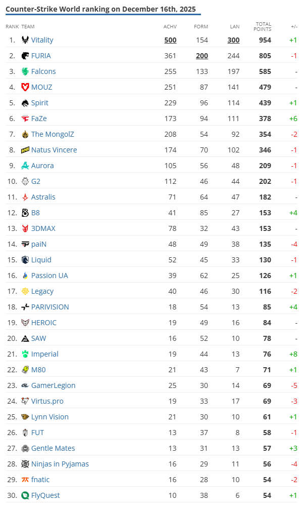 FURIA因在四分之一决赛不敌NatusVincere,未能在匈牙利延续其夺冠热门的势头,排名下滑至第二位。而FaZe则上演了从第一阶段淘汰边缘杀入Major决赛的梦幻征程,排名飙升六位。