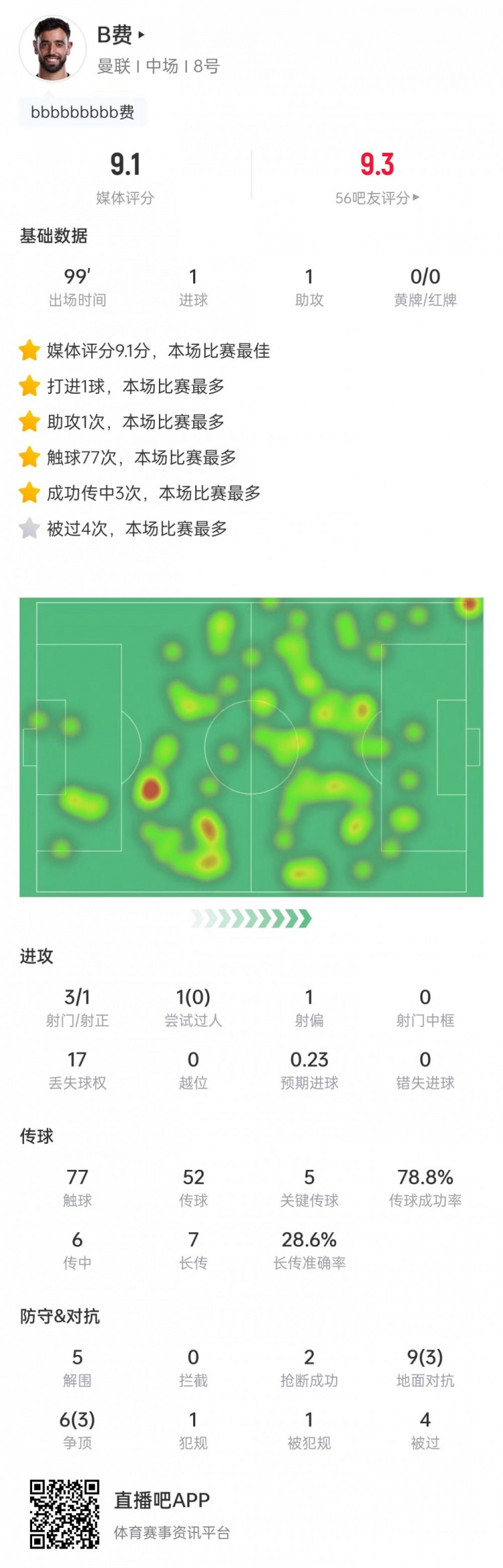 直播吧12月16日讯英超第16轮比赛,B费送出助攻+任意球直接破门,曼联主场4-4战平伯恩茅斯。