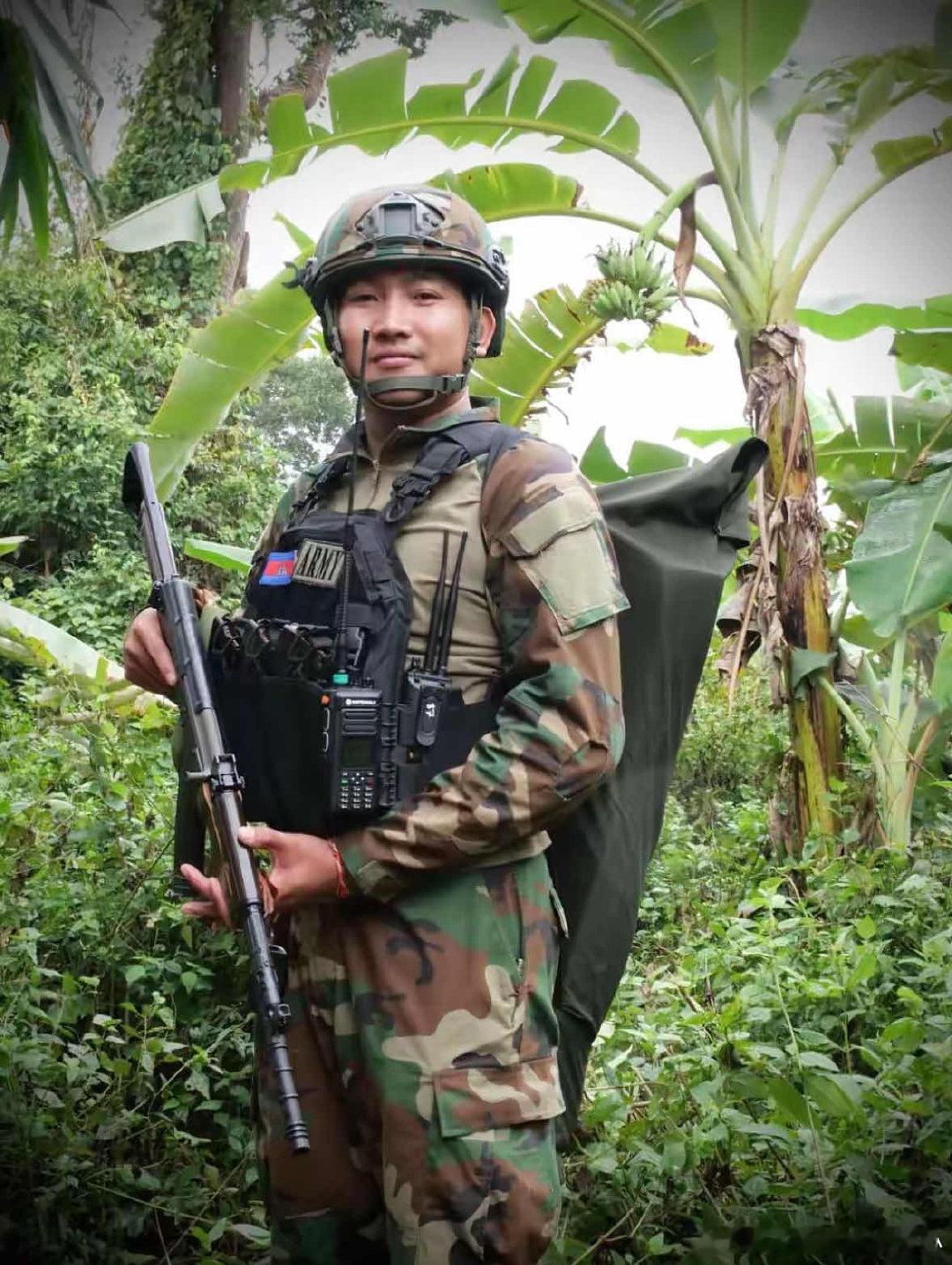 一些柬埔寨王家军士兵正穿行于丛林之中,向泰柬边境方向推进,其中一名士兵携带的是一