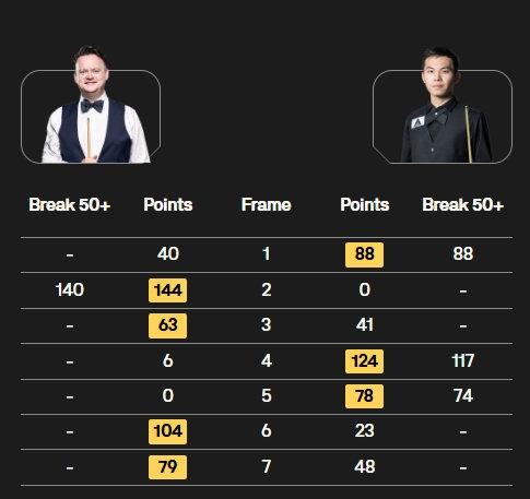 墨菲打出单杆140分,刘宏宇打出一杆破百(117)和两杆50+(88、74),刘宏宇一度3-2领先,墨菲顽强拖入决胜局并顺利拿下,最终墨菲以4-3的比分战胜刘宏宇晋级32强。