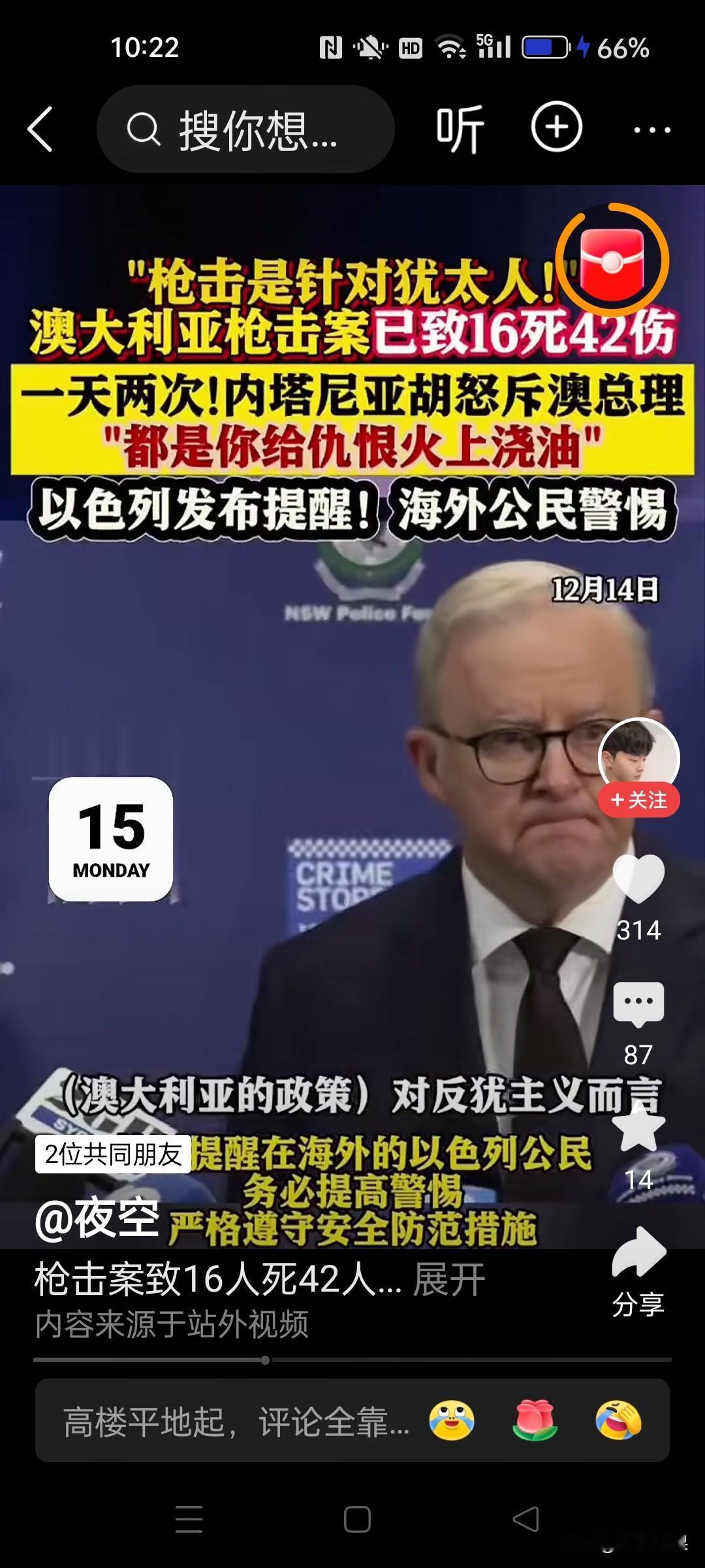 澳大利亚邦迪海滩枪击事件,是有预谋的吗?选择在犹太裔的光明节上动手?人聚集在集一起,凶手还是父子两个人。造成的死伤严重可想而知。一对普通的父子,怎么会下的了手对无辜的犹太人大开杀戒?内塔尼亚胡提醒海外的犹太人,注意安全。谴责任何形式的滥杀无辜。