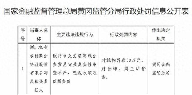 近日,湖北红安农村商业银行股份有限公司因银行承兑汇票贴现业务贸易背景真实性审查不严及违规收取短信服务费,被黄冈金融监管分局处以50万元罚款。