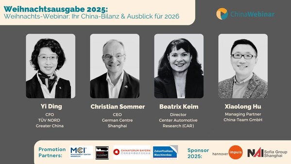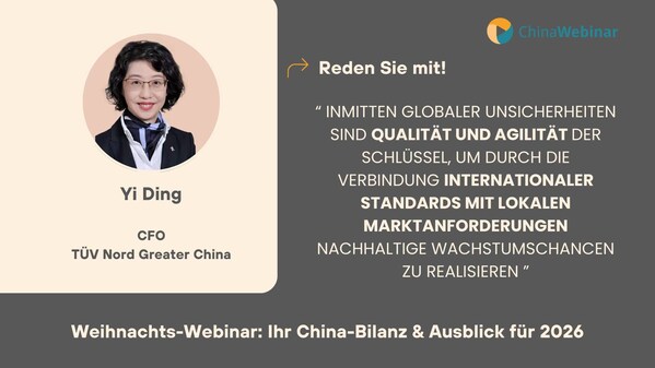 上海2025年12月16日--2025年12月11日,以"圣诞研讨会:您的2026年中国总结与展望"为主题的ChinaWebinar线上论坛成功举办,吸引了近60位中德企业家及相关行业代表参与。TUVNORD大中华区首席财务官丁一作为主旨演讲嘉宾之一,与上海德国中心首席执行官ChristianSommer、汽车研究中心(CAR)主任BeatrixKeim共聚云端,围绕中国经济与企业面临的挑战、新发展格局下的机遇等议题展开深度对话与分享。