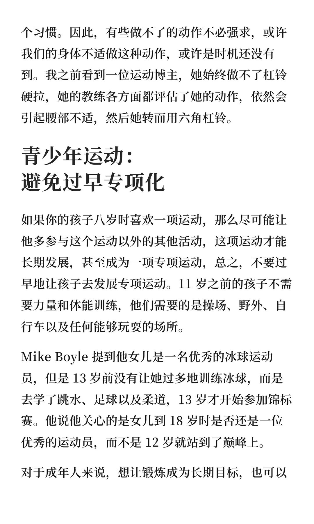 Mike Boyle让女儿13岁前学跳水、足球、柔道,13岁后才专攻冰球——目标是让她18岁时仍是优秀运动员,而不只是12岁的“巅峰”。