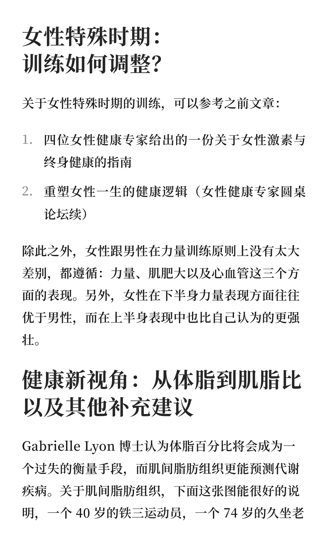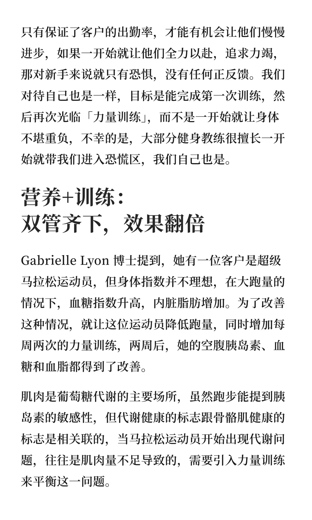 Gabrielle Lyon博士分享案例:一位马拉松跑者通过加入力量训练,仅两周就改善了血糖、胰岛素和血脂。建议每日蛋白质不低于100克,优选动物蛋白,碳水和蛋白质比例可接近1:1。