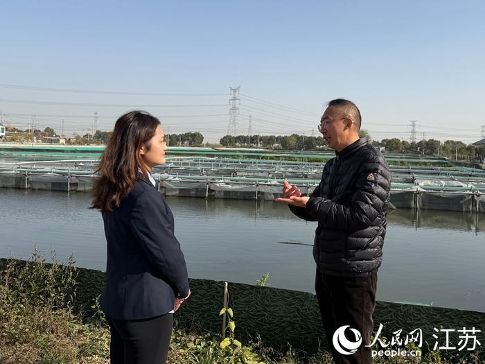 泰兴邮储客户经理(左)走访螃蟹养殖户。人民网任晓燃摄