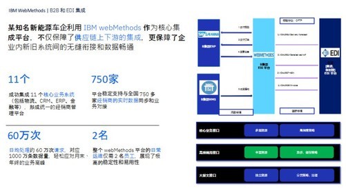 某新能源车企的实践验证了这种价值。其原有集成平台需8人团队维护,在连接750家经销商时,因EDI标准不一大幅降低了数据准确性。采用webMethods后,团队缩减至2人,通过预置的汽车行业集成模板,显著提升了数据准确性,更重要的是新市场拓展周期从三个月缩短至两周。张诚总结道:“AI时代的自动化,核心是让机器理解业务语义,而非仅仅执行固定指令。”