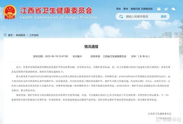 近日,有患者家属质疑南昌赣医医院救护车转运收费问题,引发舆论关注。为维护患者权益,省、市卫生健康行政部门迅速成立联合调查组,本着实事求是的原则开展调查核查。现将有关情况通报如下: