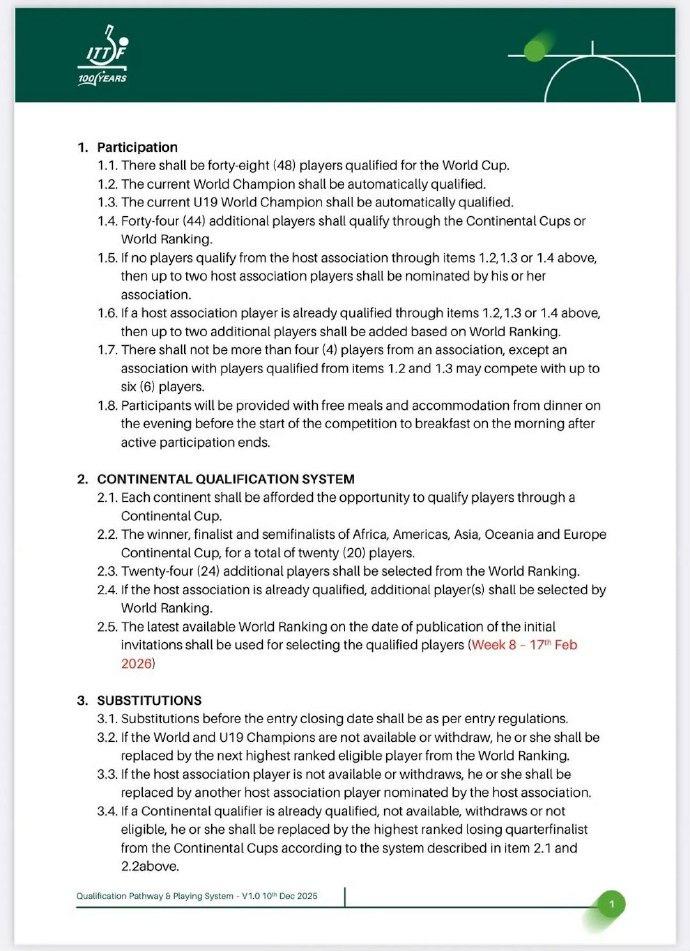 虎扑12月16日讯国际乒联发布2026澳门男子及女子世界杯资格分配规则: