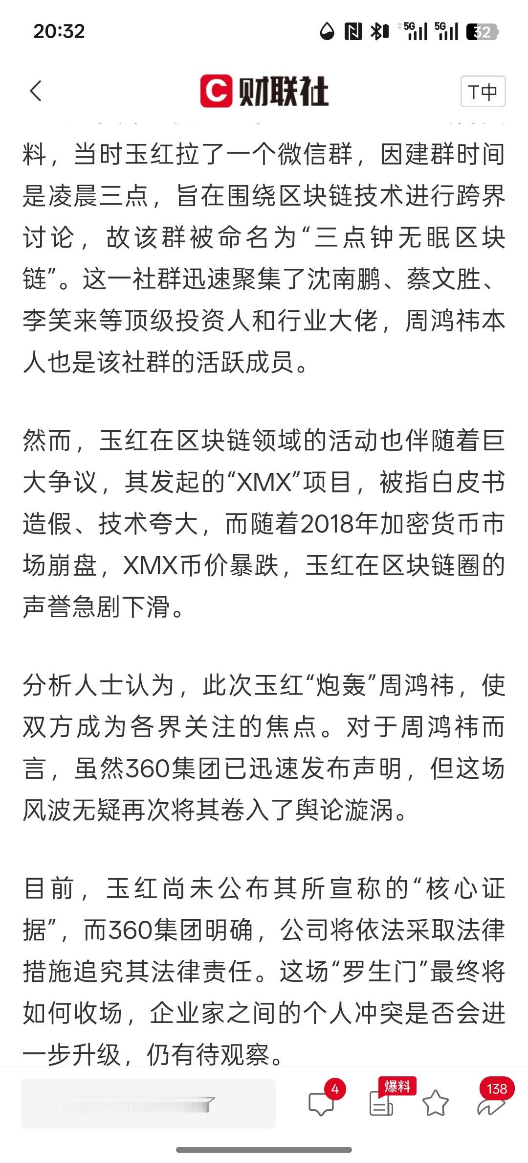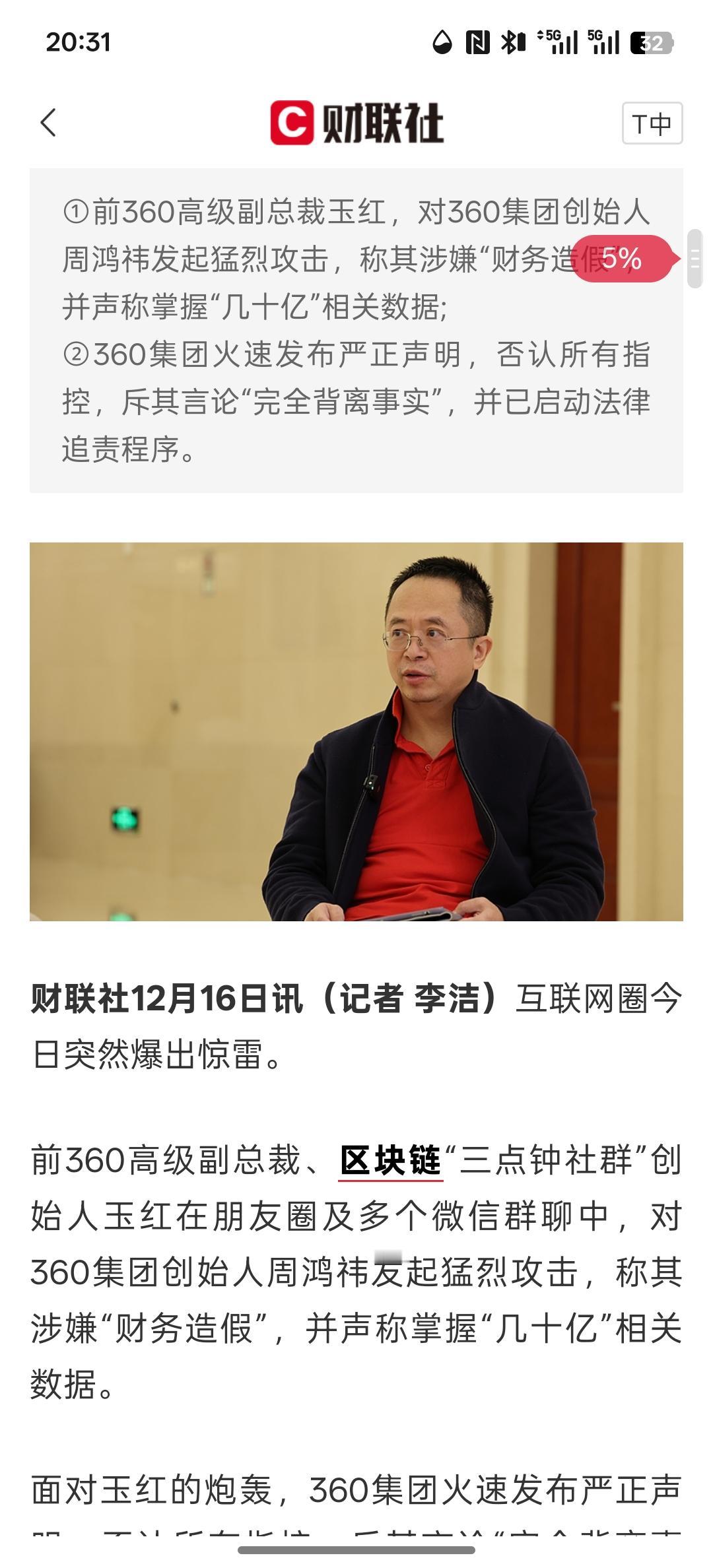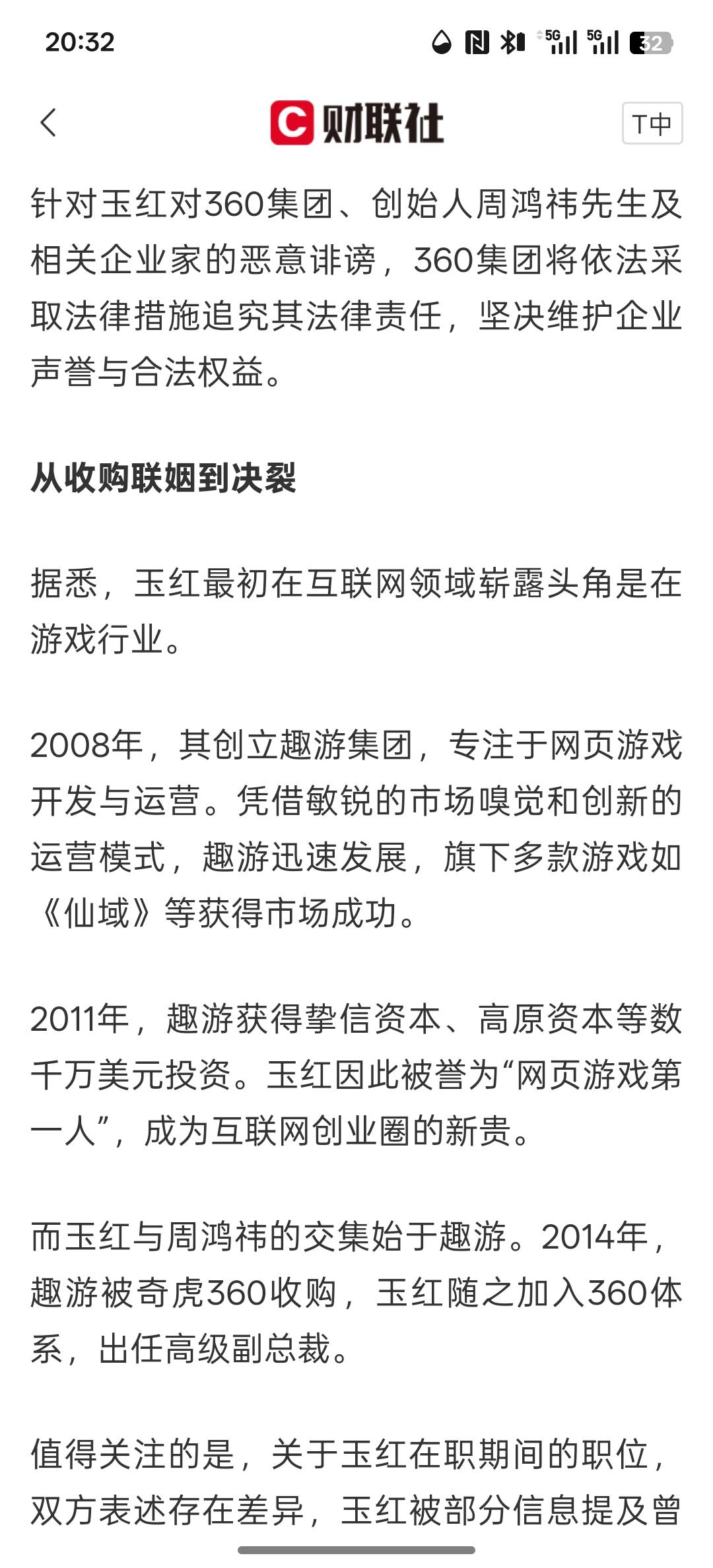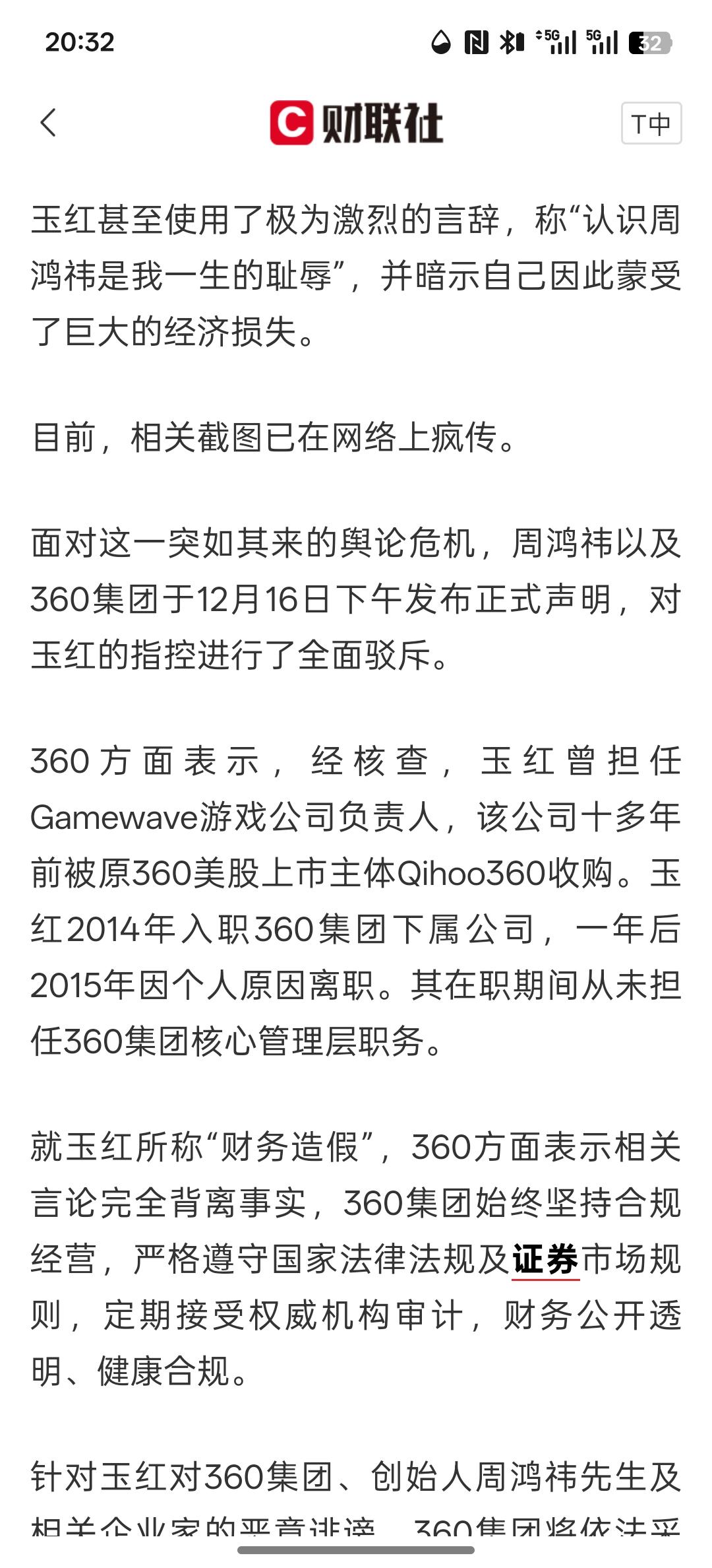 周鸿祎被指控“财务造假”,360集团发布声明,将动用法律的手段追究责任,关于财务造假的指控,360给予了否认,根据资料显示,事情源于2014年到2015年之间,是因为一款游戏的收购,最终让当事人成为了负责人,在这期间时间不长,就一年多的时间,最终因为什么原因离职?那这个事情还要追溯到十年前!但目前当事人说,有证据,有相关数据,会公布相关数据!但现在不管事情是否存在相关问题。至少短期内360会陷入舆论焦点,甚至股价会产生较大的波动! 那最终的结果是等待相关部门介入过后,才能知道最终的答案!360会动用法律的手段来维护自己的利益!到底是真是假?最终都会真相大白! 至少现在360在AI人工智能时代确实发展还不错,公司业绩正在扭亏为盈!但就当事人说认识周鸿祎是他当年的耻辱,就让他遭受了巨大的损失,所以目前就看,当事人拿出的证据是否可以证明300财务造假? 证明不了,那后续当事人的麻烦可就大了,这种事情是要负法律责任的,一旦罪名不成立,当事人肯定需要赔钱!甚至还会陷入刑事案件!