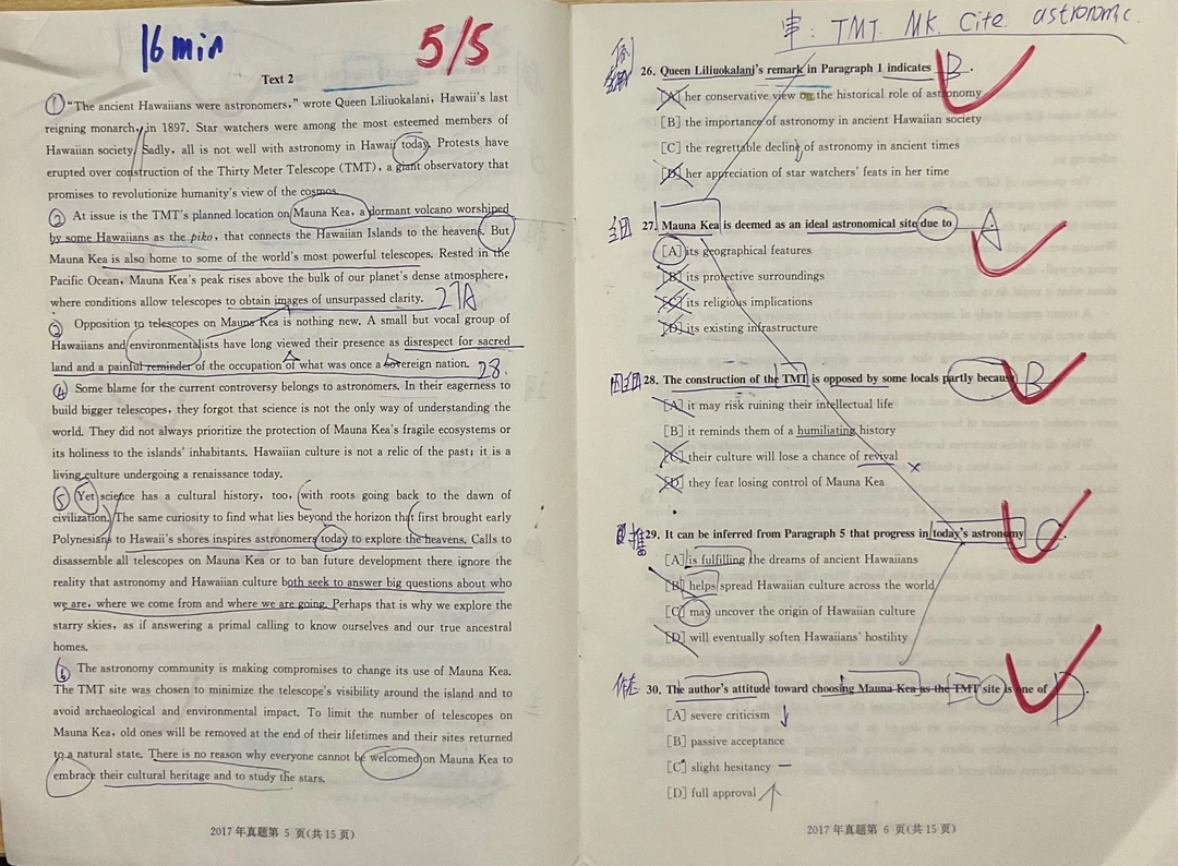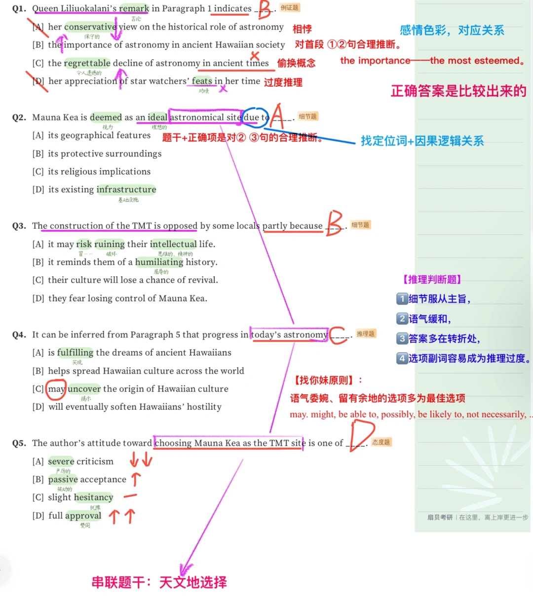 2⃣️ 推理判断题要能迅速反应出:细节服从主旨,语气缓和,答案多在转折处,选项副词容易成为推理过度。
