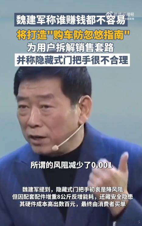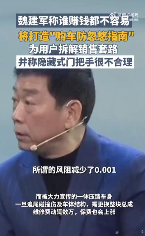 魏建军称为用户打造防忽悠指南魏建军说让每一个零件多工作10年今天看了央视新闻的“求真”对话,觉得长城汽车董事长魏建军的一个提议很有意思:要为消费者推出“防忽悠指南”。“忽悠”盛行,这的确是目前新能源汽车圈子里的一个大问题,前段时间不少官媒还批评过那些夸张的“武侠风”命名。其实花里胡哨的商品名称还算是小问题,消费者最担心的,还是自己的知情权得不到保障。就像魏建军提到的,有些宣传只提好处,而刻意忽略它增加的成本以及安全风险。例如一体压铸车身,一旦发生事故,维修费用会非常昂贵;隐藏式门把手也是一个为了创新而创新的东西,说是为了降低风阻,但现在增加了重量,还带有安全隐患。我觉得,真有这么一个“防忽悠清单”的话,消费者还是会支持的,你觉得呢?大v聊车