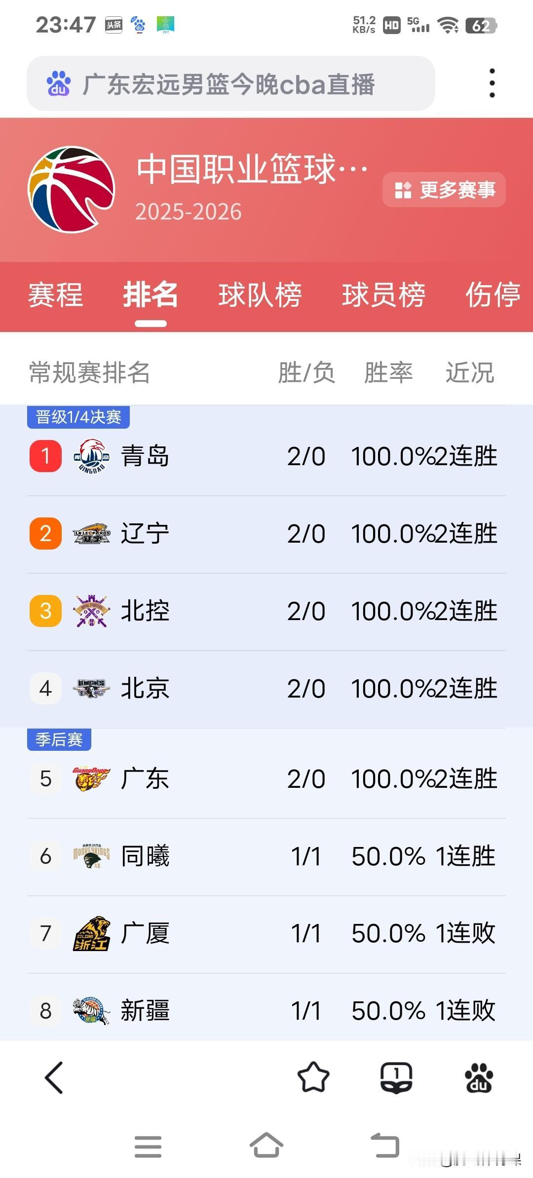 竞争激烈,冷门不断!CBA新赛季才第二轮仅有6支球队全胜: 青岛,辽宁,北京,北控,广东目前两连胜开局,广州1连胜(常规赛第二轮主场战山东延迟到3月6日开赛)冲冠热门广厦,上海均在客场爆冷输给辽宁和同曦,新赛季季后赛争夺更加激烈,各支球队的整体实力差距逐渐缩小(除四川队外)新赛季赛制改为单节是10分钟后(单场40分钟)进攻速度更快,人员轮转加速,观赏性和悬念度更高,一不小心随时都有可能出现爆冷的可能。