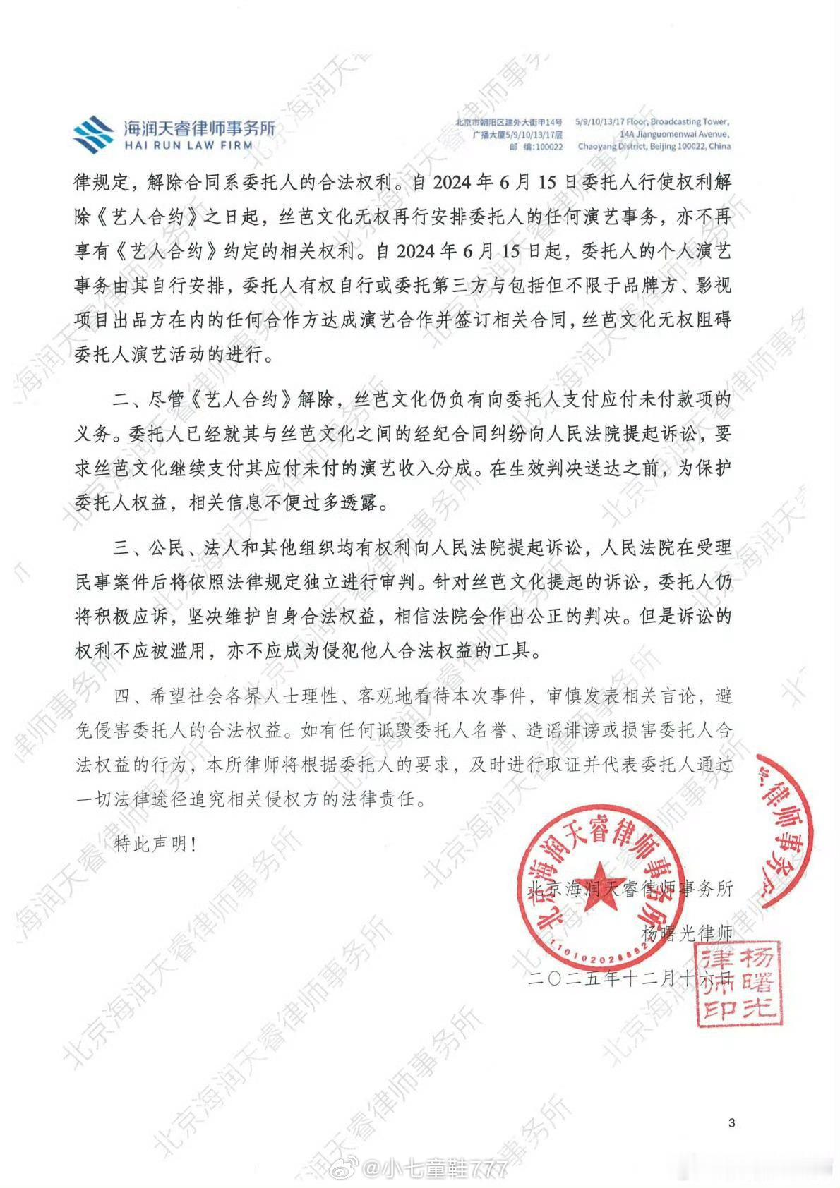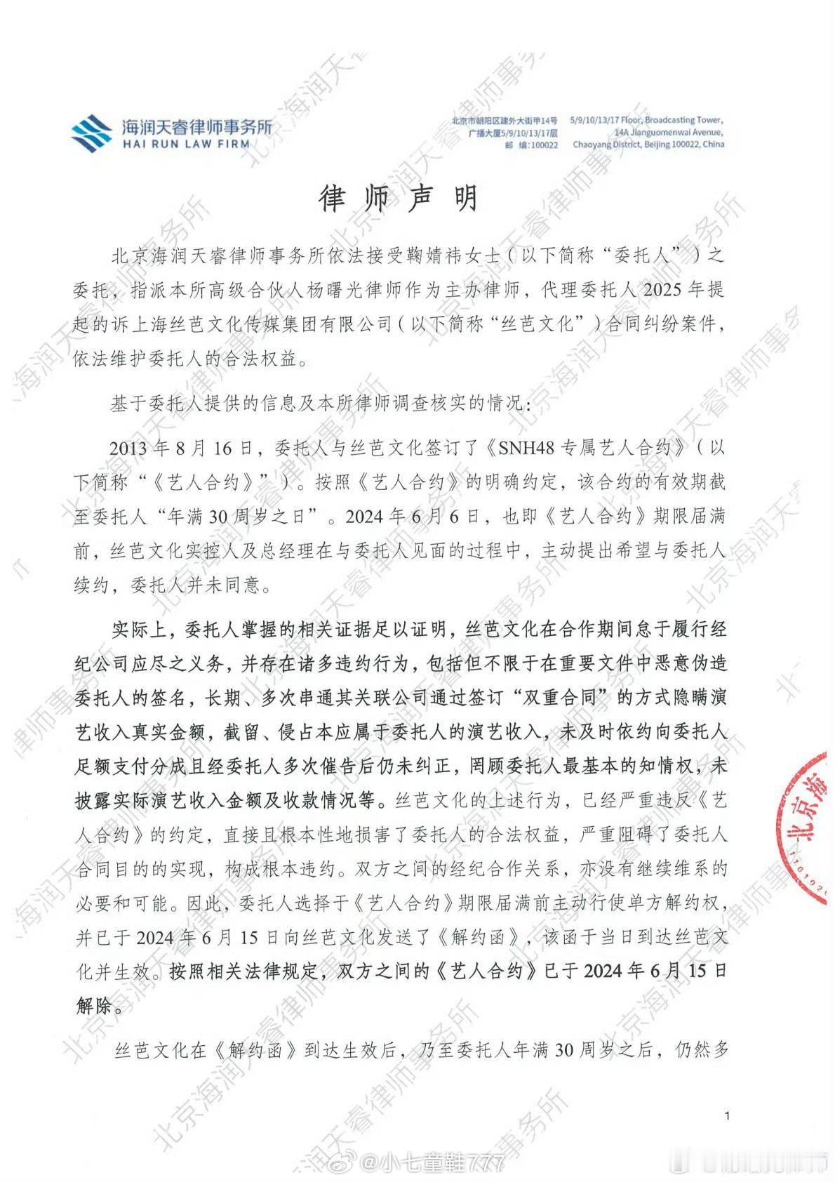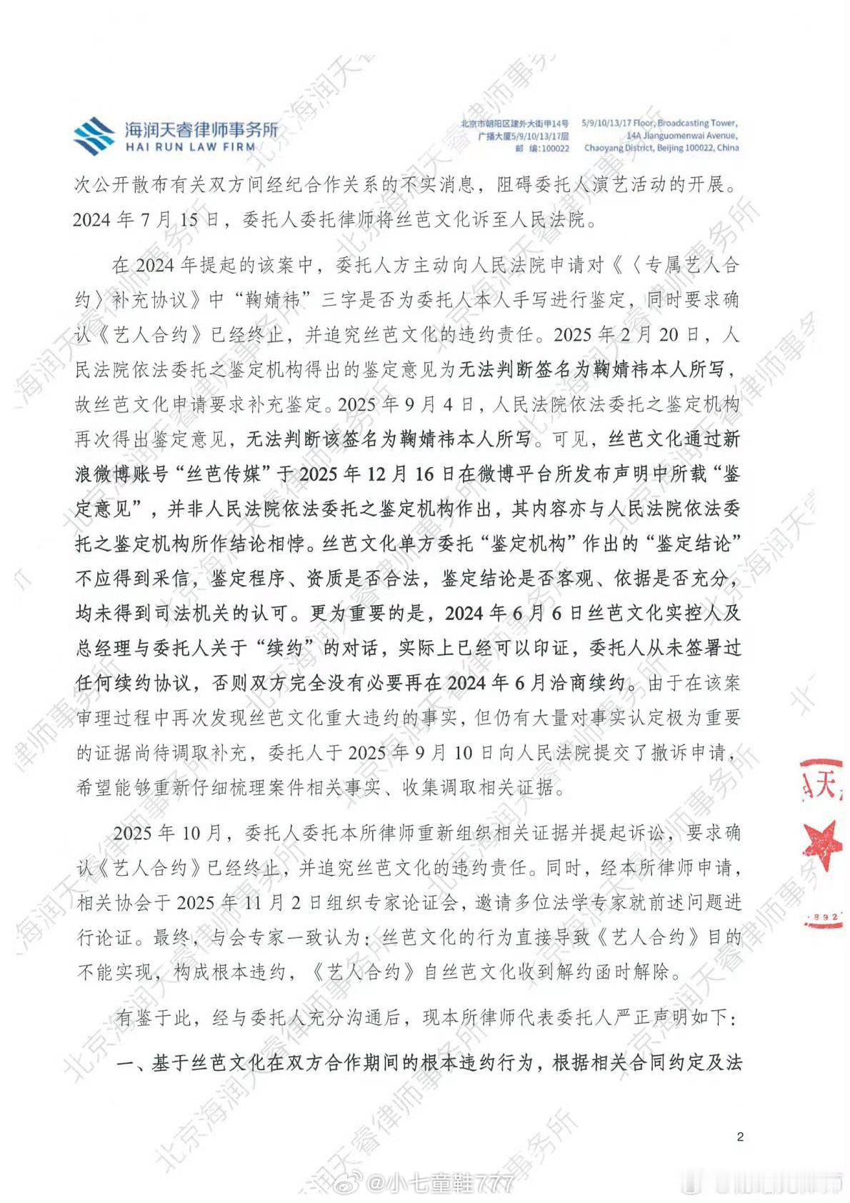 丝芭回应鞠婧祎收入争议一、丝芭声明核心内容:否认压榨并详列支出收入分配:丝芭宣称截至2024年5月,已向鞠婧祎结算支付税前金额共计1.39亿元(139,044,543.5元),并出示本人签收凭证作为证据。此外,为满足上海落户条件,每月固定支付税前25万元工资,从未拖欠。附加福利:包括配备专职司机的奔驰房车、上海市外滩155平米江景公寓(后升级更大市区住房),以及全额报销其个人及朋友的旅游、生活开销等非工作相关费用。资源投入:强调2017年起单飞后,自担风险出资1.6亿元为其定制《芸汐传》等影视项目,助其打开影视发展道路。二、鞠婧祎方反驳:指控伪造合约与隐瞒收入合约合法性争议:鞠婧祎工作室坚称原合约已于2024年6月到期终止,指控丝芭伪造2018年《补充协议》签名,试图将合约延至2033年。人民法院两次委托专业机构对签名笔迹鉴定,结论均为“无法判断是否为本人所写”,而丝芭单方委托的鉴定未被司法认可。收入截留与违约行为:代理律师声明指出,丝芭长期通过“双重合同”隐瞒真实演艺收入,截留分成,并拖欠应付账款;1.39亿仅为“结算款”而非纯分成,暗示实际应得更高。此外,丝芭被控骚扰合作方,阻碍鞠婧祎独立发展。三、舆论分化焦点收入合理性争议支持丝芭方:认为1.39亿“天价收入”体现公司厚待,艺人应感恩。支持鞠婧祎方:对比其11年贡献(占丝芭年营收35%、总选创收超1亿、解约后公司剧场收入暴跌42%),1.39亿属行业偏低水平。 丝芭的舆论策略通过公布“1.39亿”转移公众视线,利用仇富心理淡化合约伪造争议。遭前助理驳斥:所谓“报销福利”实为工资扣除,住房车辆仅使用权。芸汐传 1.6亿鞠婧祎收入