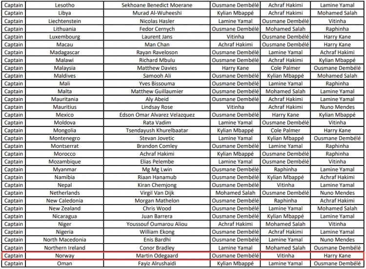 直播吧12月17日讯FIFA年度最佳球员投票,挪威队长厄德高的选择出炉,他的第一选择是登贝莱。