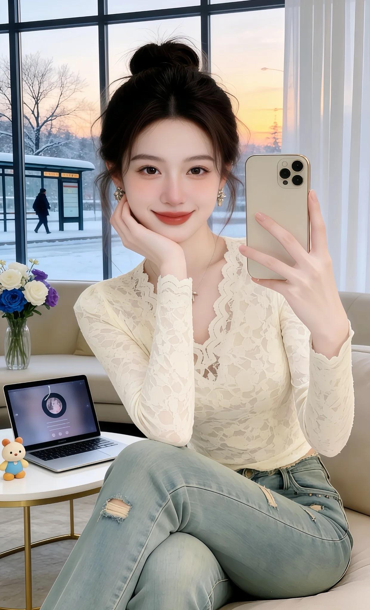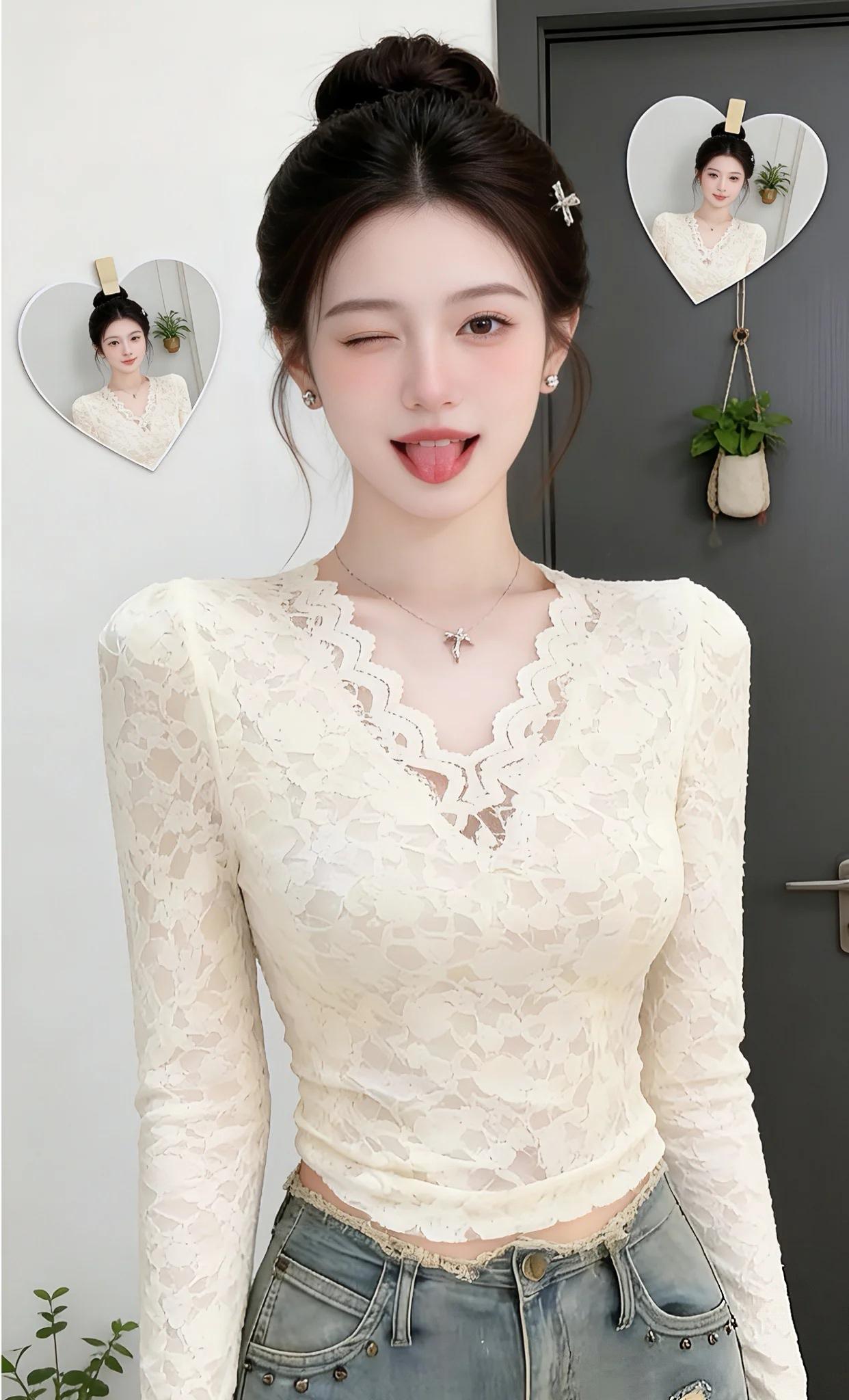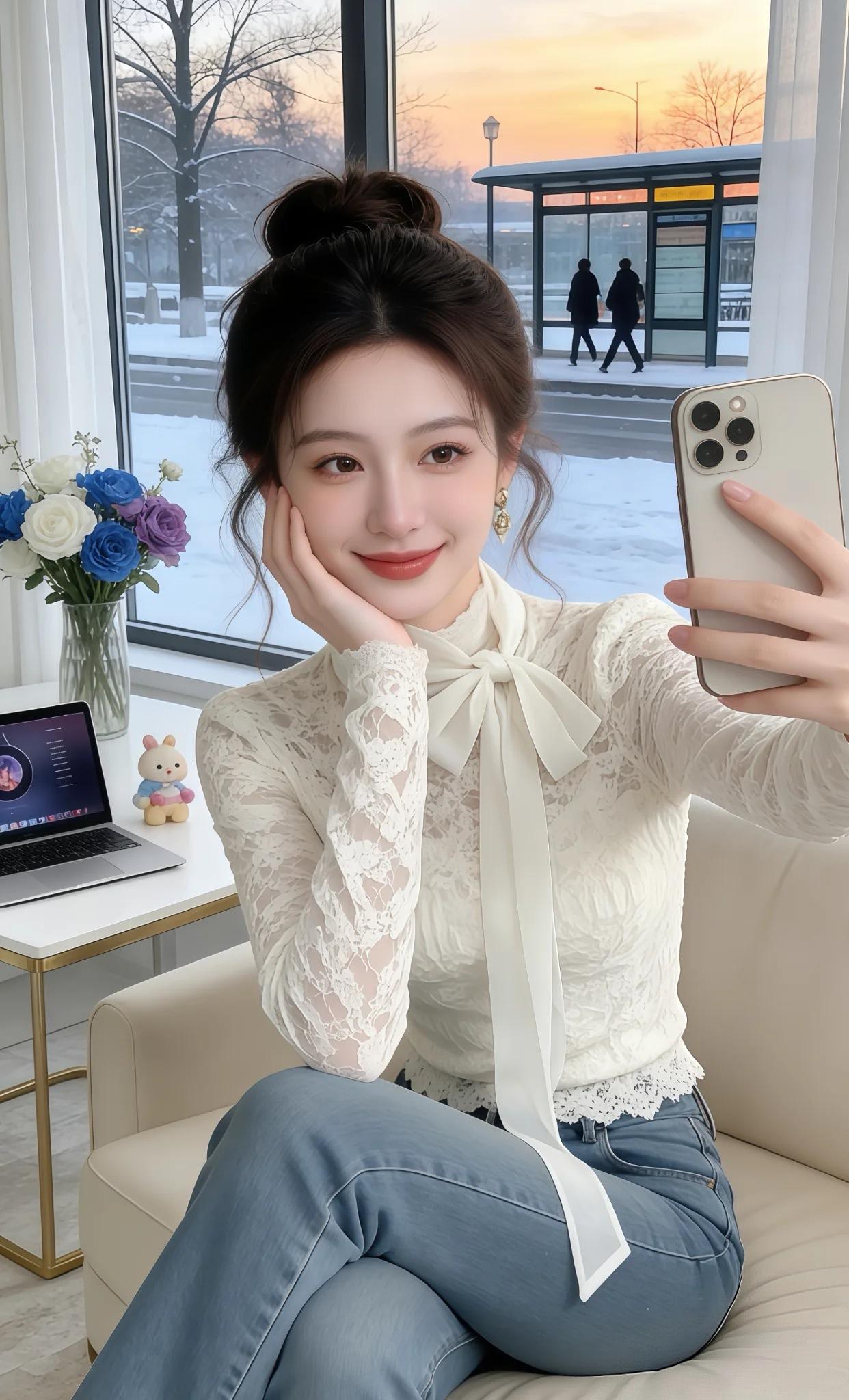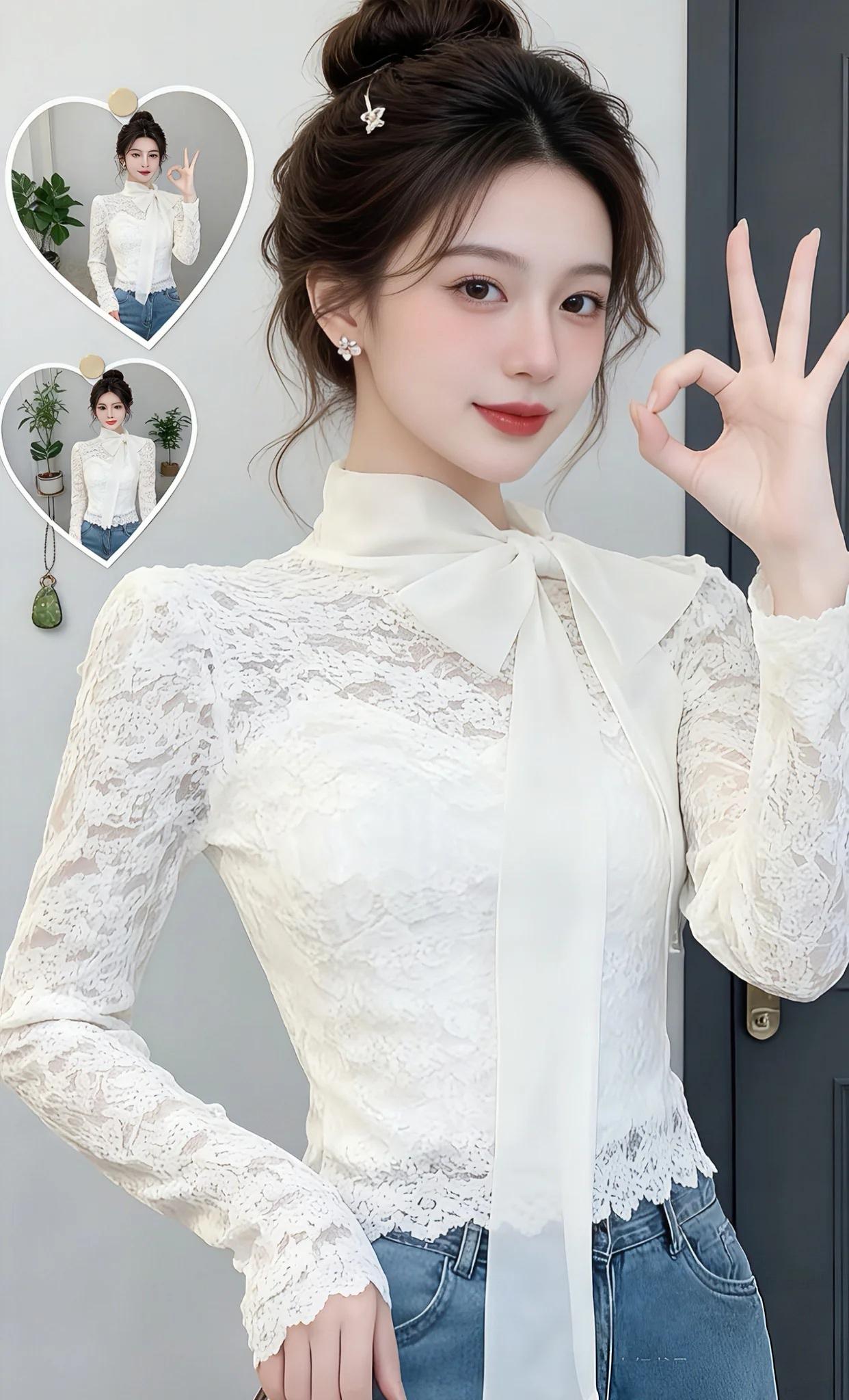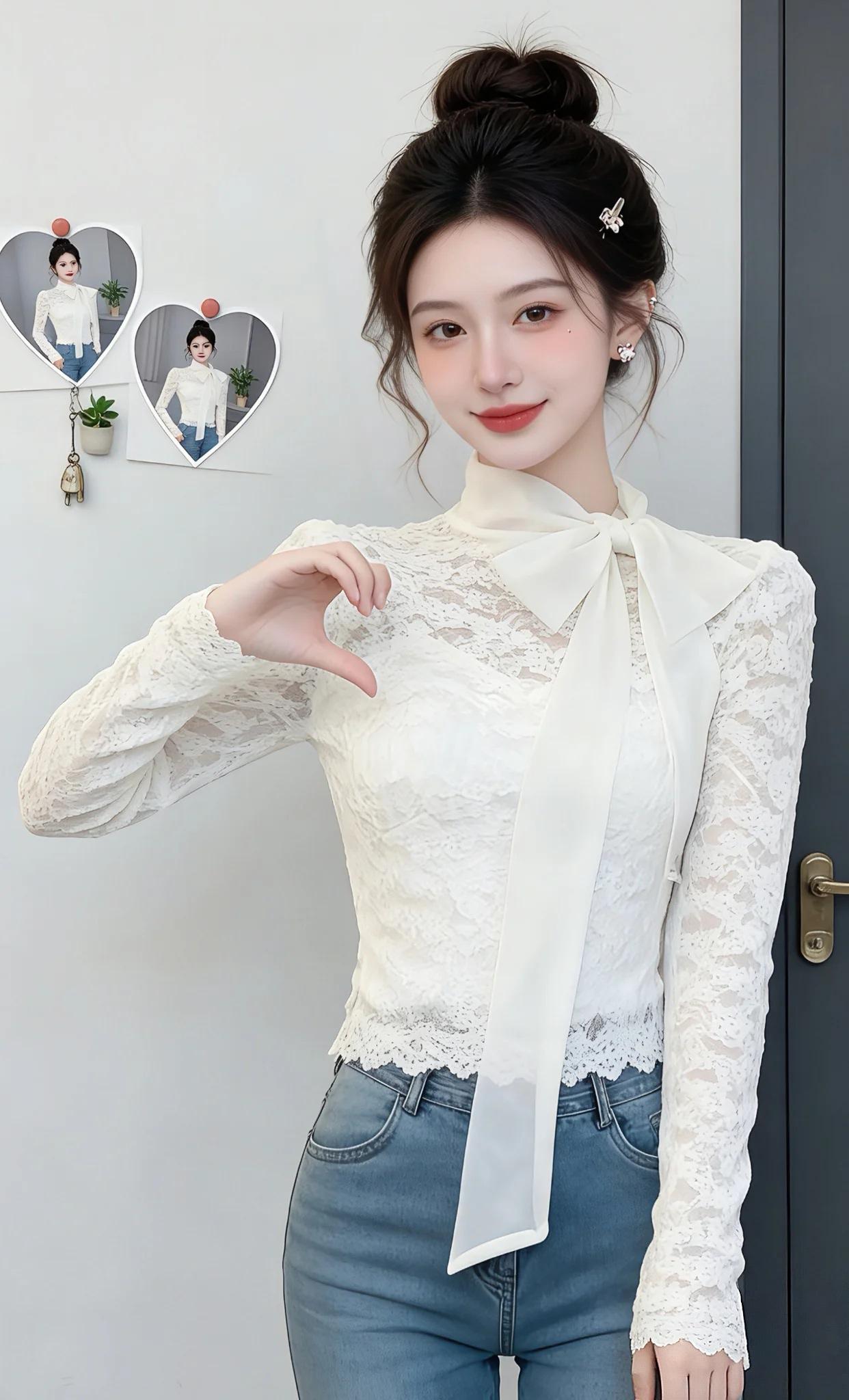 这是一张展示女性时尚穿搭的图片。图中主体为一位年轻女性,她身着一件白色蕾丝长袖上衣,上衣设计精致,领口系有同色系的宽大蝴蝶结,增添柔美与层次感。下身搭配浅蓝色牛仔裤,整体风格清新且具现代感。女性发型为盘起的丸子头,点缀小巧发饰,妆容自然精致,唇色柔和,展现出温柔优雅的气质。 她的左手做出“OK”的手势,表情温和微笑,传达出轻松愉悦的情绪。背景简洁,以浅灰色墙面为主,右侧可见部分深色门框,左侧有两个心形边框的小图,展示了同一服饰的不同角度或搭配效果,强化了服装展示的主题。 这张图片很可能用于服饰推广或穿搭分享场景,通过模特的直观演绎展现单品的设计亮点与穿着效果,强调蕾丝材质的细腻质感与蝴蝶结装饰的甜美风格,适合日常或轻社交场合穿着。