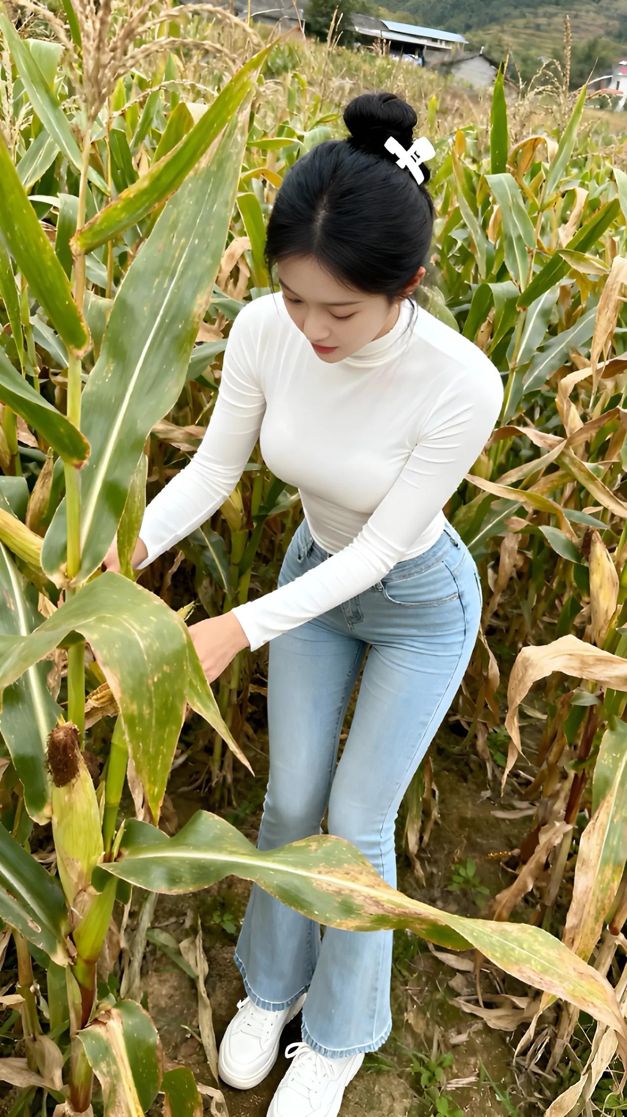 这是一张在户外拍摄的图片。图中显示一个年轻女性在一片玉米地里。她穿着一件白色高领长袖上衣和一条浅蓝色牛仔裤,脚上是一双白色运动鞋。她的黑色头发盘成一个发髻,用一个白色发夹固定。她正蹲在玉米植株旁,双手轻触一株玉米,似乎在检查或欣赏它。背景中可以看到更多的玉米植株,以及远处的山丘和一些建筑物。整个场景显得非常自然和宁静。