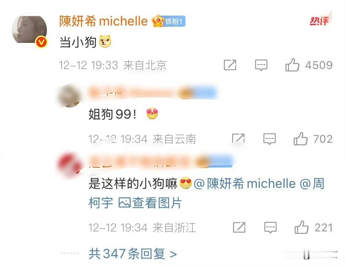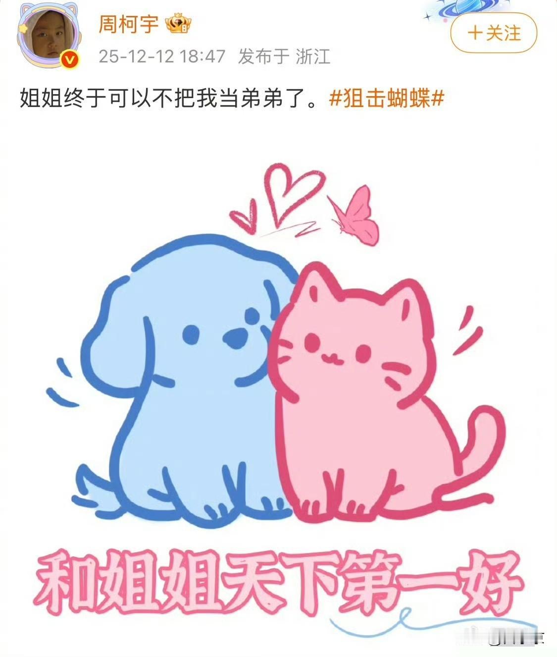 周柯宇喊话姐姐别当弟,陈妍希笑怼:那就当小狗!网友炸了:这谁能不磕? 周柯宇一条剧宣微博直接让评论区炸开锅了! 他写:“姐姐终于可以不把我当弟弟了。” 这话里话外的意思,谁看了不浮想联翩啊? 正当大家搓手期待是不是要官宣啥的,陈妍希直接冲上来回复:“可以当小狗!” 好家伙,一盆冷水……不对,是一罐蜜糖泼下来,这反转绝了!