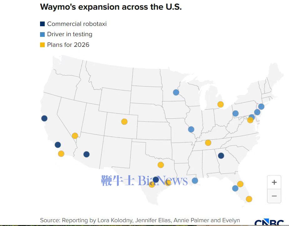 2026年,Waymo计划在达拉斯、丹佛、底特律、休斯顿、拉斯维加斯、迈阿密、纳什维尔、奥兰多、圣安东尼奥、圣地亚哥和华盛顿特区开通服务。该公司还宣布计划于2026年在伦敦推出服务,这将标志着Waymo首次进军海外服务区域。