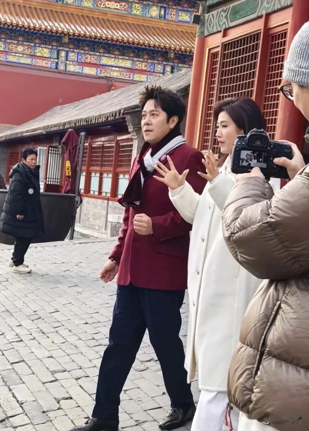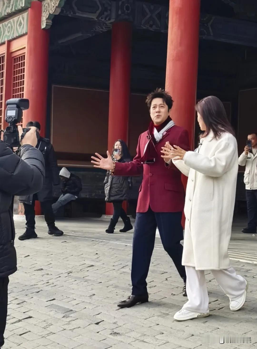 蔡国庆现身北京录节目,穿着一件酒红色西装,戴着花色围巾,脚上穿了一双尖头皮鞋,他