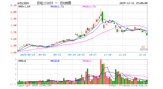 12月16日,日经225ETF(513880)跌2.13%,成交额1.39亿元。当日份额增加50.00万份,最新份额为12.15亿份,近20个交易日份额增加950.00万份。最新资产净值计算值为19.78亿元。