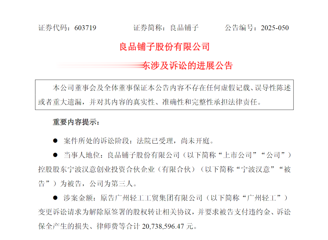 但宁波汉意及其一致行动人在2025年5月28日没有与广州轻工签署相关股权交易协议。为此,广州轻工向宁波汉意发出《关于督促签署交易协议的函》,并于7月14日就股权转让纠纷对宁波汉意提起诉讼,以及申请了财产保全,冻结宁波汉意所持良品铺子约7976万股股份。该笔股份占良品铺子总股本的19.89%,占宁波汉意所持股份的56.46%。
