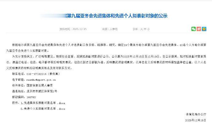 虎扑12月17日讯国家体育总局官网公示关于哈尔滨第九届亚冬会先进集体和先进个人拟表彰对象名单。