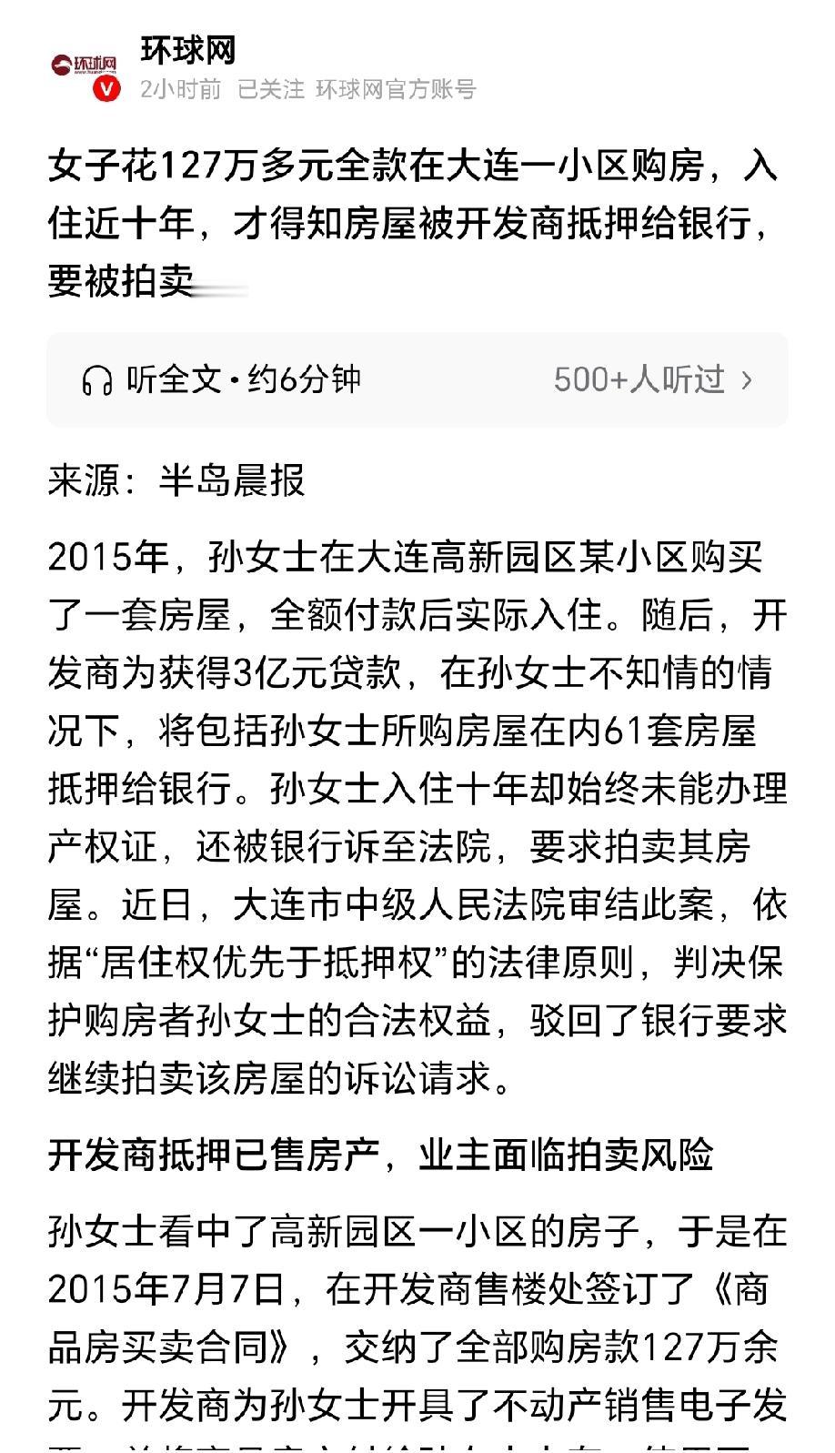 “细思极恐!”辽宁大连,女子十年前花127万多元购买了一套商品房,签订了房屋买卖合同,并一次性付清了全款。第二年,开发商资金周转困难,就把女子所在小区的61套房抵押给银行,贷款了3个亿。后来,开发商无力还款,银行把开发商告上法庭,并申请拍卖这61套商品房。看到门上的拍卖公告和封条,女子傻眼了,这是她唯一的家,也是合法购买的,开发商不讲武德,凭什么拍卖她们的房屋?提起执行异议后,法院的判决让女子感受到公平正义的力量。 2015年7月,孙女士揣着半辈子的积蓄,在高新园区某小区购买了一套商品房,并签下了《商品房买卖合同》。 为了不背房贷,孙女士掏空积蓄,一次性支付了127万多元的房款。 一想到这是她往后几十年安稳的家,看着手里不动产销售的发票,孙女士心里踏实得不行,只盼着赶紧装修入住,安安稳稳过日子。 可她怎么也没想到,这份安稳背后,早已埋下了一颗“定时炸弹”。 2016年年底,资金周转困难的开发商,偷偷摸摸把包括孙女士这套房在内的61套商品房,抵押给银行贷了3个亿。 这事儿孙女士和邻居们半点风声都没听到,她每天忙着上班、打理家事,日子过得平淡又充实,完全没留意到房产证的事儿一拖再拖。 一晃近十年过去,孙女士早把这套房当成了真正的归宿。 直到2024年12月,她下班回家,一眼瞅见自家大门上贴着法院的查封公告和封条,说这套房要被拍卖抵债。 孙女士当场就懵了,大脑一片空白,她使劲揉了揉眼睛,反复确认门牌号,没错,这就是她住了快十年的家。 全款买的房,踏踏实实住了这么多年,凭什么法院说拍卖就拍卖?孙女士又气又慌,她实在不知道遭遇了什么。 她赶紧联系其他业主,这才发现有61户人家跟她一样,都面临着房子被拍卖的困境。 大家抱团取暖,连夜委托律师,向大连市中级人民法院提出了执行异议。 孙女士攥着那份泛黄的购房合同和全款发票,心里五味杂陈,她非常害怕自己半辈子的心血打了水漂。 孙女士实在想不通,这套房子是她合法购买、合规入住,没占半点便宜,怎么就会稀里糊涂的被法院查封呢。 原来,开发商贷款逾期后,因为无力还款,被银行告上法庭。 银行拿出房屋抵押合同和贷款协议,事实很清楚,法院支持了银行的诉讼请求,判决开发商败诉,并强制执行这61套房屋。 这才导致孙女士她们不知情,房屋却被法院查封和拍卖。 开发商不讲武德,卖了房屋又偷偷去银行抵押,银行也不审查,直接给开发商放贷,现在却要孙女士他们弥补银行的损失,哪有这样的道理? 孙女士和邻居们赶紧提起执行异议之诉,希望能保住他们的合法财产。 法院审查发现,孙女士在房屋被查封前,就已经和开发商签了正式合同,交清了全部房款,而且早就实际入住,这套房还是她的唯一住房。 2025年5月,法院先裁定中止了对孙女士房屋的拍卖。 可银行不服气,坚持说自己早就办理了抵押权登记,对这套房享有优先受偿权,又把官司打到了法院。 依据《最高人民法院关于商品房消费者权利保护问题的批复》第二条规定:商品房消费者以居住为目的购买房屋并已支付全部价款,主张其房屋交付请求权优先于建设工程价款优先受偿权、抵押权以及其他债权的,人民法院应当予以支持。 本案中,孙女士这套房是其唯一生活用房,购买初衷是满足家庭居住需求,而非投资盈利。 她在2015年就一次性付清127万余元全款,开发商也开具了合法的不动产销售发票,付款义务已全部履行。 从权利冲突逻辑来看,银行的抵押权虽办理了登记,但形成于孙女士购房之后,且孙女士对抵押行为毫不知情,无任何过错。 依据《最高人民法院关于审理执行异议之诉案件适用法律问题的解释》第十一条规定:符合以下三个条件的购房者可排除抵押权人的强制执行。 (一)查封前,案外人已与房地产开发企业等签订合法有效的书面买卖合同;(二)查封前,案外人已支付全部价款;(三)所购商品房系用于满足家庭居住生活需要。 孙女士在2015年就与开发商签订了合法有效的《商品房买卖合同》,早于2024年法院对房屋的查封时间,合同关系合法成立。 其次,她一次性支付了全部购房款,并非部分付款或按揭购房,已完全履行买受人的核心义务。 最后,案涉房屋是其唯一居住用房,不存在多套房产或投资性购房的情形。 银行虽以抵押权已登记为由主张优先受偿,但该条款明确了商品房消费者的权利可对抗抵押权人的强制执行,即便抵押权已被生效文书确认,也应优先保护其居住权益。 今年12月12日,市中院最终判决驳回银行要求拍卖房屋的诉讼请求,解除了对孙女士房子的查封,案件受理费也由银行承担。