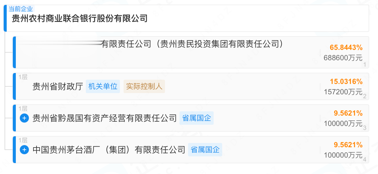 作为地方国有企业,茅台集团早已涉足对地方金融机构的股权投资,目前是贵州银行和贵阳银行的股东之一。根据企查查最新数据显示,茅台集团持有贵州银行约12%的内资股,为该行第二大内资股股东,仅次于贵州省财政厅;同时,还持有贵阳银行约1.45%的股份。
