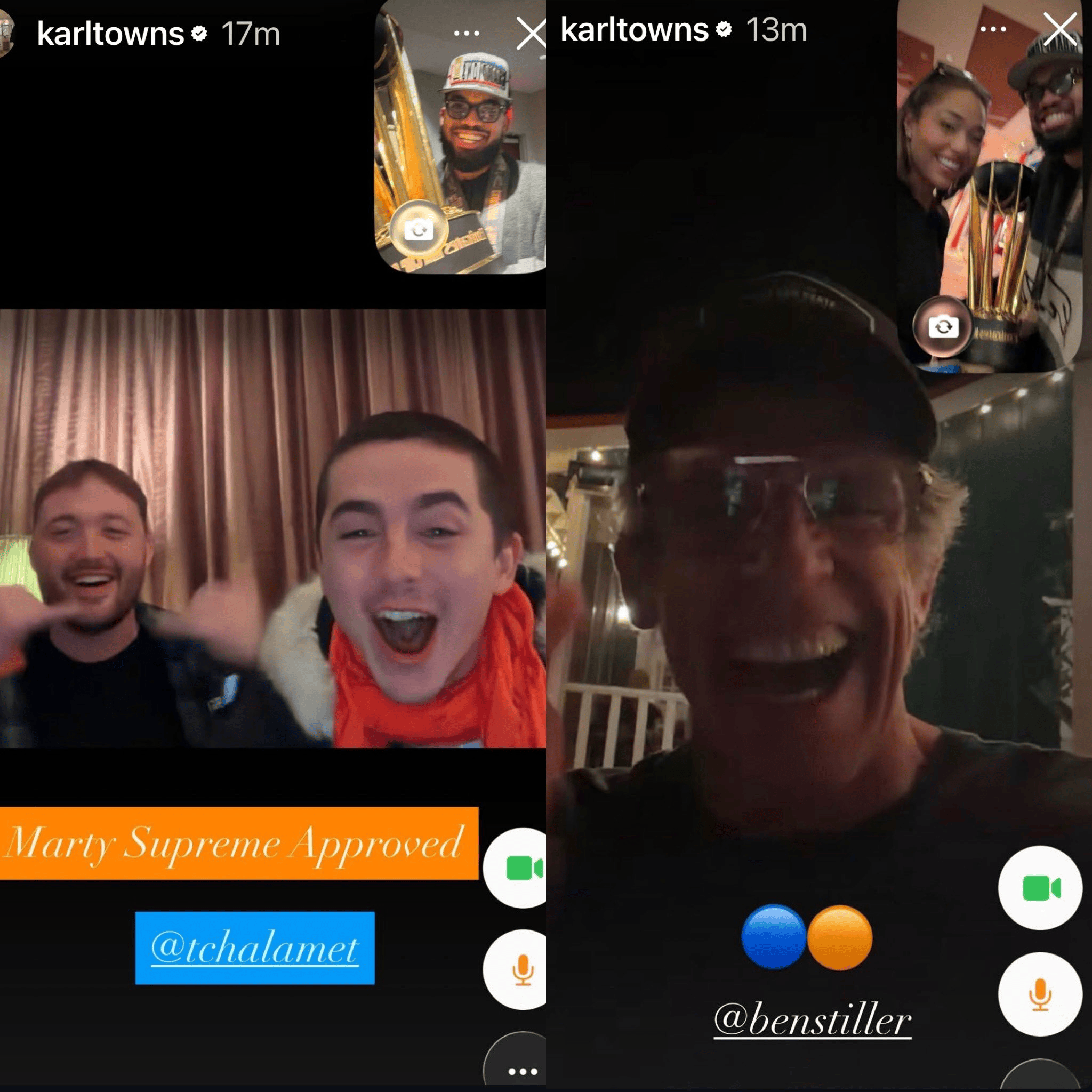 唐斯赛后INS晒出视频截图,和著名演员“甜茶”提莫西-查拉梅、本-斯蒂勒视频庆祝夺冠。