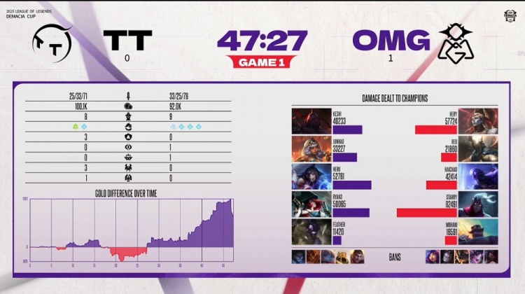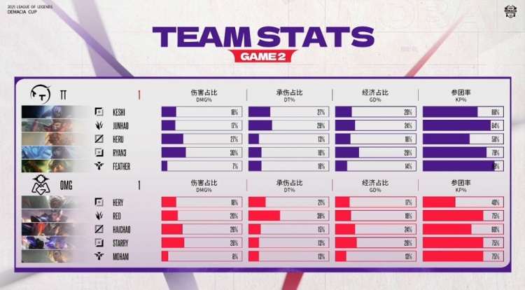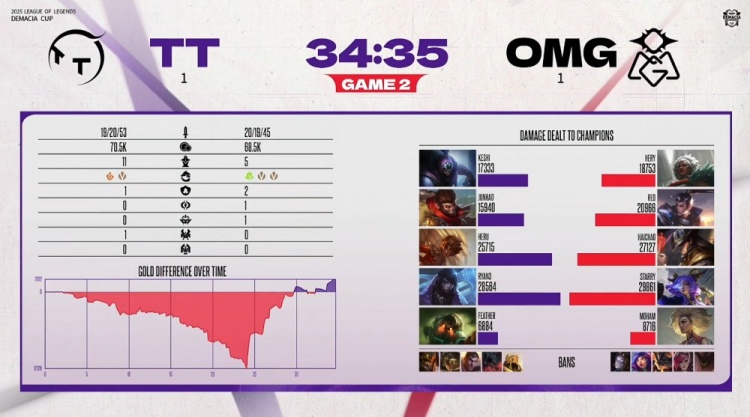 后期OMG拿到电龙魂,TT虽然拿到老龙与大龙但难上OMG高地,后续TT在OMG高地反被团灭,OMG双C接管比赛,一波推平TT基地先下一城。