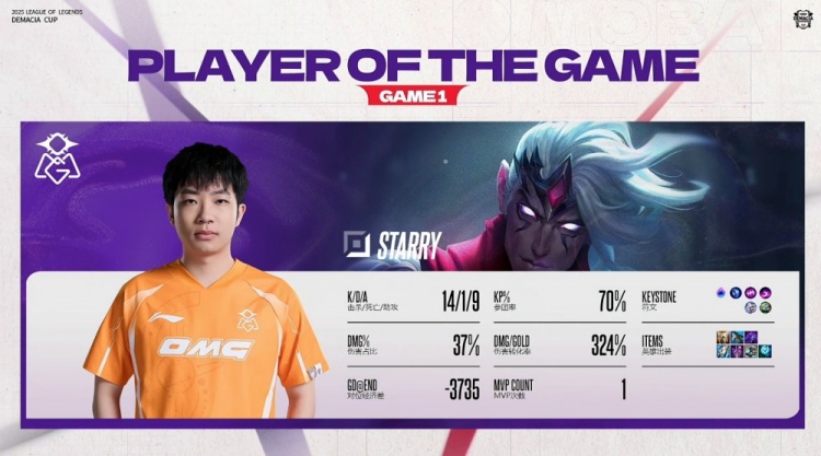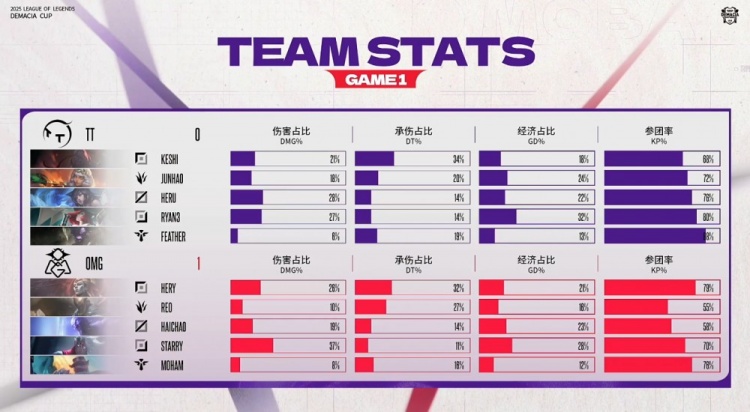 第一局前期Feather牛头想要越塔击杀残血Hery亚恒却被后者塔下反杀送出一血,随后Junhao奇亚娜各路gank取得成效。先锋团Hery亚恒大赦先斩Ryan3女枪后再杀Feather牛头,Junhao奇亚娜被Starry韦鲁斯点掉,OMG打出0换3拿到先锋,双方经济持平。