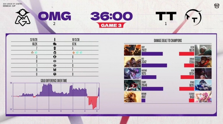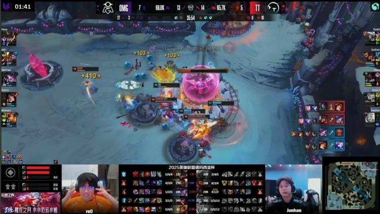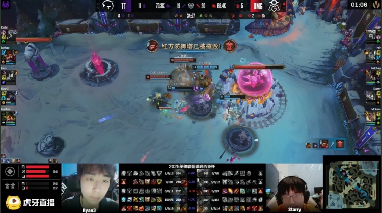 中期OMG轻松拿到先锋,Starry芸阿娜联手haichao瑞兹融化TT,20分钟OMG经济优势来到1w后拿到厄塔汗。但随后OMG下路推进反遭TT打出0换4,但TT经济劣势依旧存在6k。