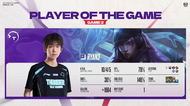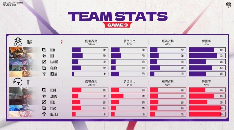 后期Ryan3厄斐琉斯三杀让TT拿到大龙,随后TT下路再杀Hery安蓓萨,经济优势瞬间缩小至1k。龙魂团OMG双C阵亡,TT打出2换3经济反超1k。最终Ryan3厄斐琉斯三杀收尾,TT一波推平OMG基地扳回一城。