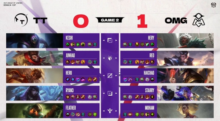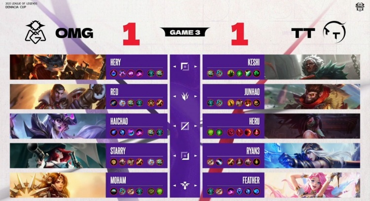 第三局Junhao猴子开杀,TT一路听牌水龙魂,中路团战Heru阿卡丽进场带走OMG上辅后狂轰三杀,TT经济领先2k。后期TT上野下路迷路,OMG打出0换2,一波推平TT基地拿到比赛胜利。