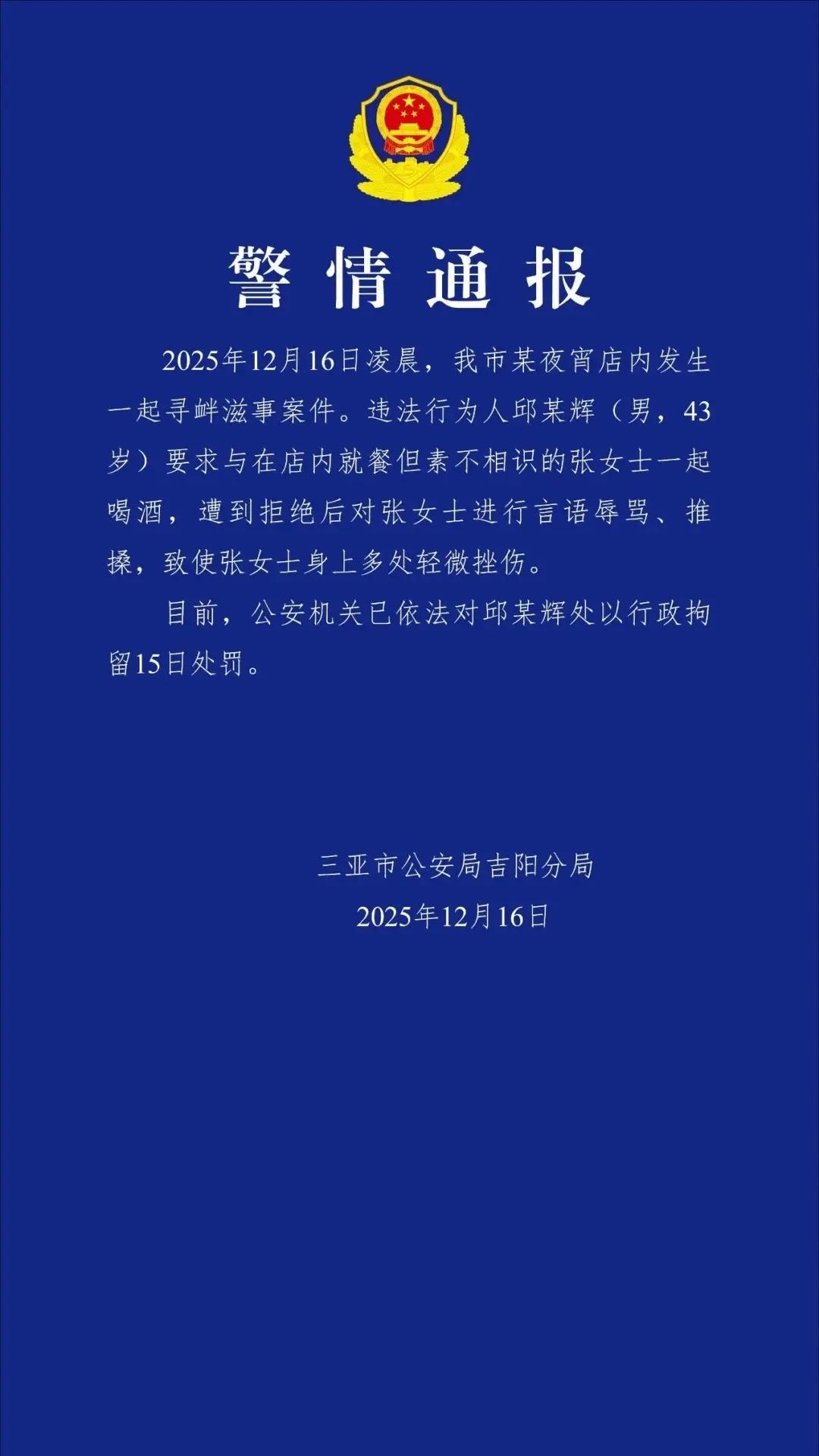海南三亚,43岁男子凌晨在店里吃夜宵,他看邻桌女子长得有几分姿色,就拿着酒瓶晃悠到女子身边,让她陪自己喝两杯,女子和他素不相识,当场拒绝,男子遭拒后恼羞成怒,嘴里开始不干不净,还拽起女子,一直推搡她,女子几次倒地,导致面部、身上多处轻微挫伤,报警后,男子被行拘15天。 2025年12月16号凌晨,路边的夜宵店里依然很热闹。 43岁的邱某辉端着啤酒杯晃到邻桌,非要拉着素不相识的张女士陪他喝两杯。 张女士正吃着烤串和闺蜜聊天,突然被陌生男人搭讪,寻思这人谁啊?我跟你认识吗? 妹子,咱碰个杯呗?邱某辉凑近了,那股酒气直往张女士脸上喷。 张女士本能地往后缩,有些不悦,但她还是礼貌回复,说自己不喝酒。 邱某辉被拒后脸一沉,嗓门立刻拔高:装什么清高?陪哥喝两杯能掉块肉咋的? 周围几张桌子的人听见动静都转头看过来,张女士的火气也上来了,觉得眼前这名男子真是太过无理。 闺蜜小声劝她别搭理,可邱某辉不依不饶,手指头都快戳到张女士鼻尖了。 张女士站起来想换个位置。邱某辉却推了一把她的肩膀。这一推让张女士翻倒在地,手肘也磕在铁桌角上,疼得她呲牙咧嘴。 她低头一看,胳膊已经呲破皮,渗出了血。 张女士也没心思吃饭了,作势要离开。这年头在外面,能不惹事就不惹事,她不想跟一个醉酒之人起冲突,惹不起,她还躲不起吗? 邱某辉见张女士要走,更来劲了,嘴里不干不净地骂着,手也跟着推搡起来。 张女士的闺蜜吓得赶紧掏手机报警,邱某辉却浑然不觉,还在那儿骂骂咧咧。 没一会儿,夜宵摊老板跑过来拉架,可邱某辉像喝了假酒似的,疯疯癫癫,根本拉不住。 张女士想走,却被邱某辉拽住衣服,撕扯中后背又撞到柱子,疼得不行。 这下张女士彻底绷不住了,她直接掀翻桌子,想让邱某辉知道,她也不是那种任由人欺负的女人。 邱某辉一看这架势,手上动作更大了。 直到警察来了,邱某辉这才有点清醒了。民警冲过来把他按住时,他还不服气,寻思不就喝个酒吗?至于这么小气? 可手铐一戴,他才意识到事情闹大了。 张女士后来去医院检查,医生说是轻微挫伤,没伤到骨头。 可大晚上吃个夜宵都能碰上这种事,她也真是够倒霉的。 可转念一想,警察已经处理了,自己也没大碍,又觉得算了。 邱某辉被拘后,民警问他知不知道错在哪。他说当时喝多了,脑子不清醒。 而且他觉得,自己就推了几下,能有多大事? 然而,轻微伤也是违法,人家没还手不是怕你,是懂法! 第二天,警方通报了处理结果:邱某辉因寻衅滋事被行政拘留15天。 不过在张女士看来,15天还是太便宜他了,这种骚扰别人的人就该重罚! 也有人说了,应按寻衅滋事罪追究刑事责任,处罚过轻了。 这种人就跟草一样,不论哪个城市遍地都有,要想治理,必须法用重典,本案是典型的寻衅滋事,应按寻衅滋事罪进行刑事处罚,而不是治安拘留了事。 总之,邱某辉 15天拘留不冤!他喝多了耍酒疯,欺负陌生姑娘。人家张女士好好吃个夜宵,他非逼着喝酒,被拒绝后还骂人推搡,结果把人弄伤了。 公共场合这么撒野,既没素质又违法。张女士没还手是对的,直接报警最管用。 出门在外,尤其是晚上,遇到这种人得赶紧躲开,同时必须让法律好好治治这种“社会渣子”,给他们点教训! 那么,从法律角度,怎么看待这件事? 《治安管理处罚法》第43条规定:殴打他人的,或者故意伤害他人身体的,处五日以上十日以下拘留,并处二百元以上五百元以下罚款;情节较轻的,处五日以下拘留或者五百元以下罚款。 邱某辉在夜宵店内因要求与素不相识的张女士喝酒被拒后,对张女士实施了言语辱骂和推搡行为,导致张女士多处轻微挫伤。这个行为符合故意伤害他人身体。 虽然伤情未达到轻伤以上标准,但已构成对他人身体权的侵害,符合治安管理处罚的立案条件。 邱某辉的行为发生在公共场所,且针对素不相识的陌生人实施,具有随机性和突发性,对公共场所秩序造成一定干扰。 此外,邱某辉在遭拒后持续升级冲突,主观恶性较大,符合“情节较重”的认定标准。 根据规定,邱某辉的行为不涉及结伙、伤害特殊群体或多次伤害等加重情节,因此适用基础款中的“十日以上十五日以下拘留”档次。 公安对邱某辉处以行政拘留15日的处罚,属于“情节较重”的范畴。 邱某辉的违法行为不仅需承担行政责任,还可能面临民事赔偿。张女士可依据《民法典》第1179条要求邱某辉赔偿医疗费等损失。 不要以为在公共场所的随意骚扰、辱骂或肢体冲突,即便未造成严重伤害,也可能触犯治安管理法规,切莫肆意妄为。 对此,你怎么看? 关注@运良说法. 学法律知识不迷路