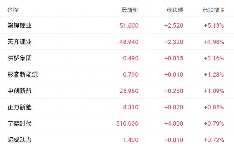 今日港股锂电股的表现亮眼。截至发稿,赣锋锂业(01772.HK)涨5.13%、天齐锂业(09696.HK)涨4.98%、洪桥集团(08137.HK)涨3.16%、宁德时代(03750.HK)涨0.79%。