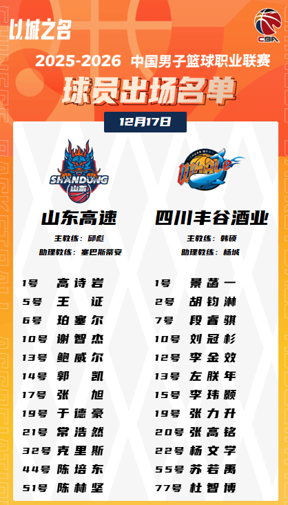 虎扑12月17日讯今晚CBA常规赛,山东男篮与四川男篮大名单已经公布。
