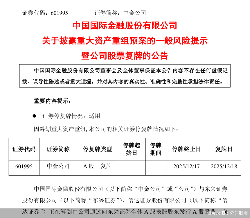 北京商报讯(记者刘宇阳)12月17日,中金公司与东兴证券、信达证券同步披露重大资产重组预案,中金公司换股吸收合并两家公司迎来重大进展,并拟于12月18日复牌。